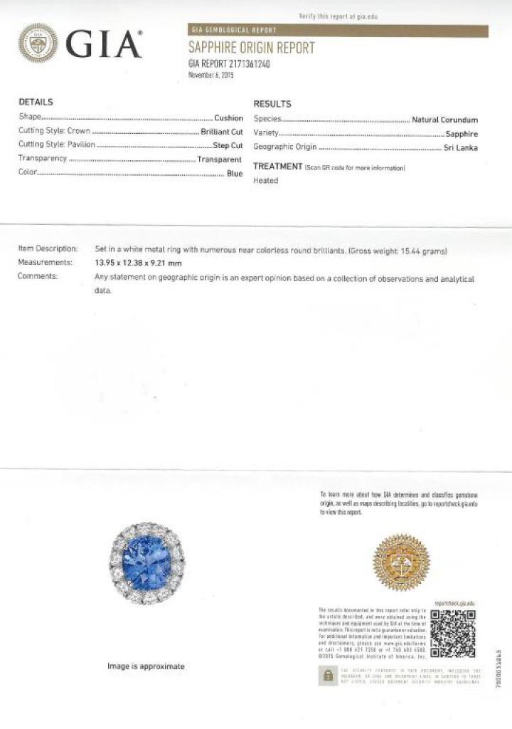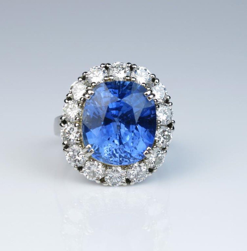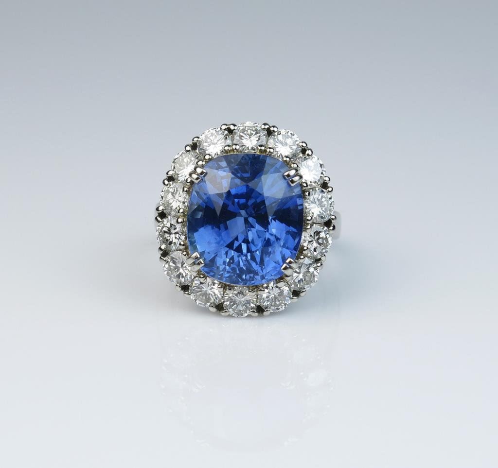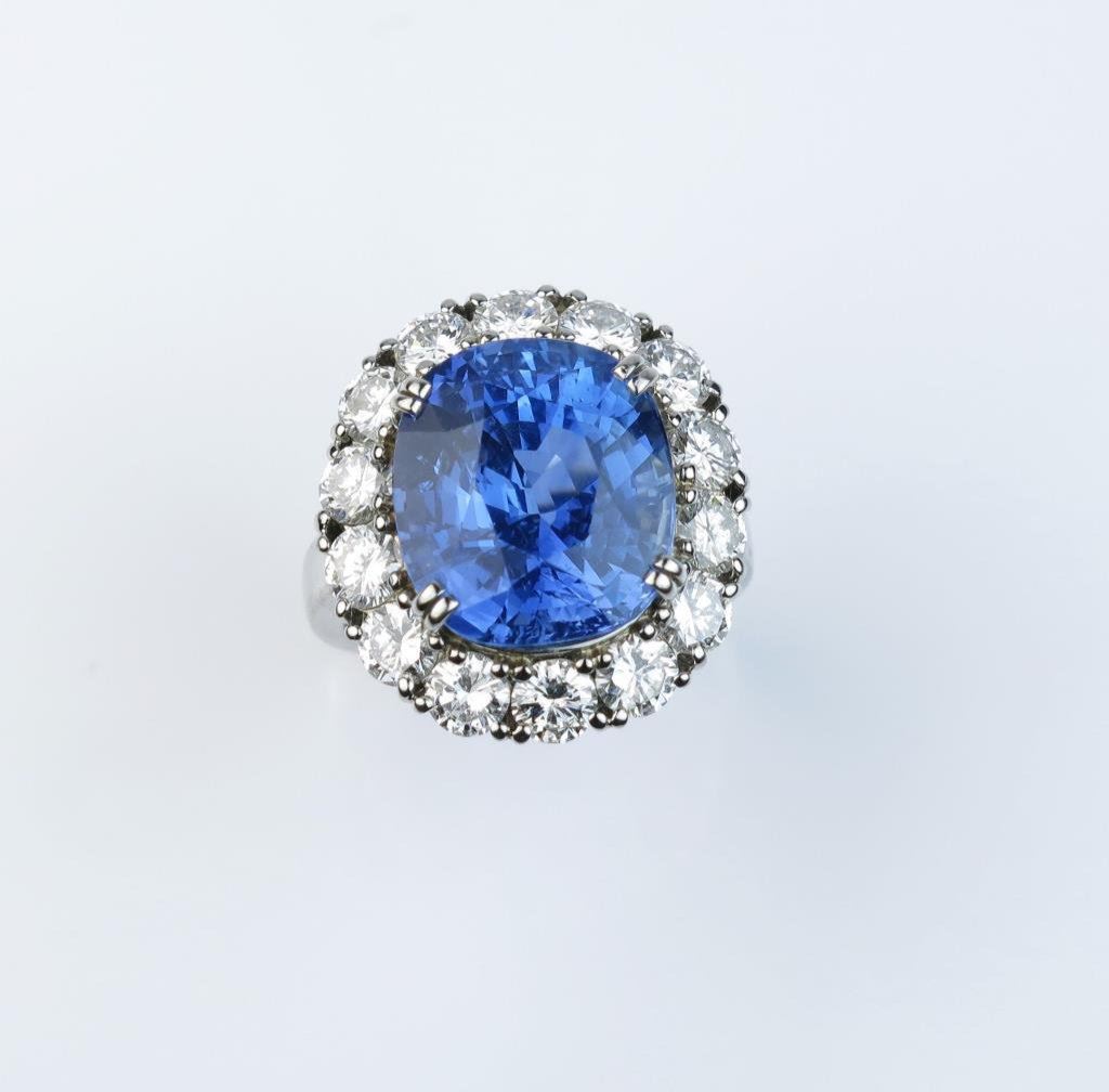 Ceylon Sapphire weighing 13.22 carats and surrounded by 14 full cut diamonds weighing approx 2.67 carats of F-G colors set in a custom handmade Platinum mounting Full Retail Appraisal at $105,000.00 Est:$40,000-60,000