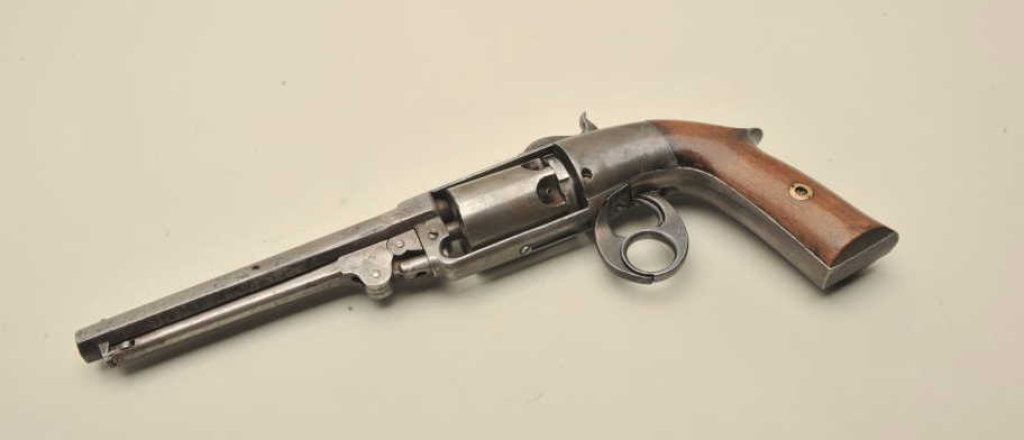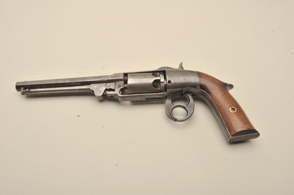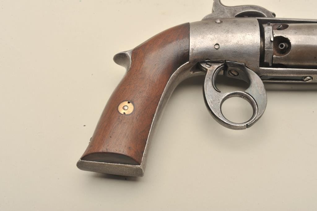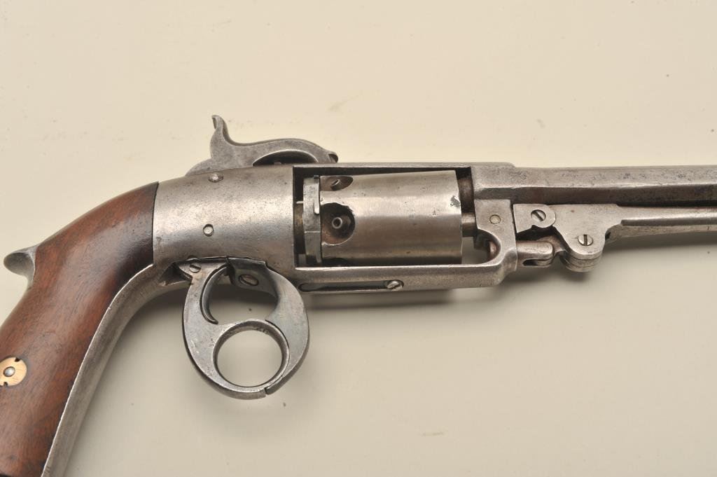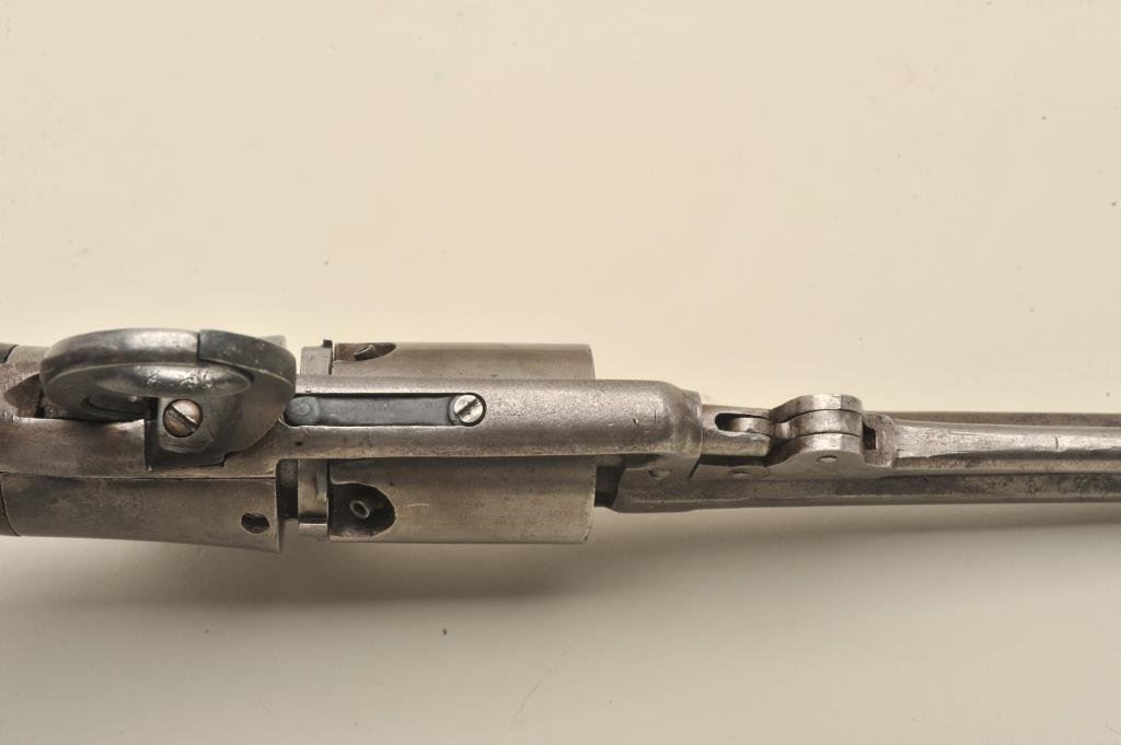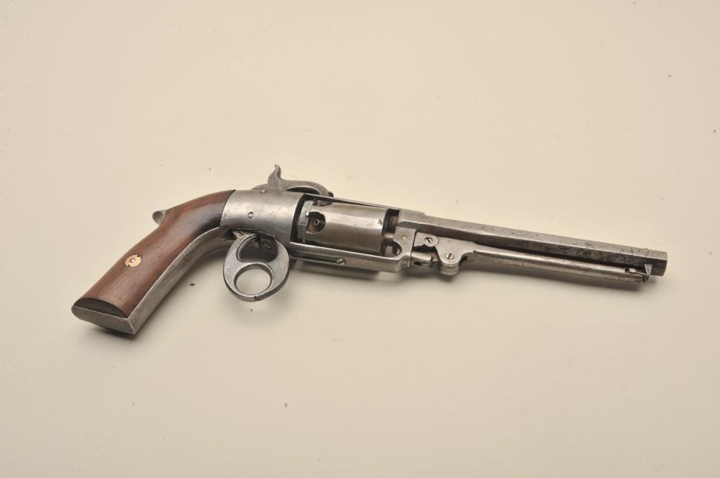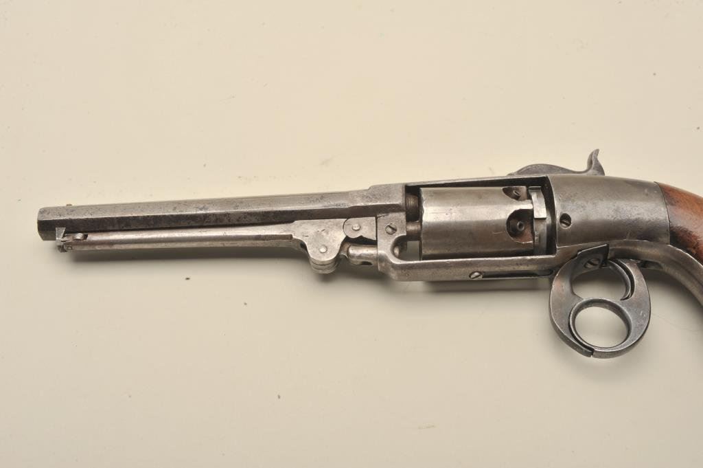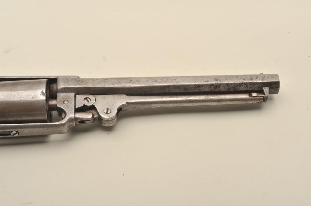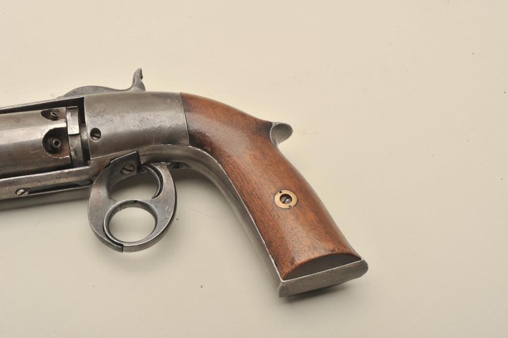 and one of approximately 50 produced making it among the rarest of all Civil War era produced percussion revolvers (Refer Flayderman 7A-094) in .36 caliber percussion with a 7 1/8” octagon barrel and wood grips. The revolver remains in good to very good condition showing a gray patina finish with some minor erosion and slight to moderate pitting and erosion. The address is fully visible on the top of the frame and the action cycles well and locks up tight. The grips have been lightly freshened and cleaned expertly. The rammer assembly is original. A museum quality American rarity with only a handful known. (Antique) Est.: $6,000-$12,000