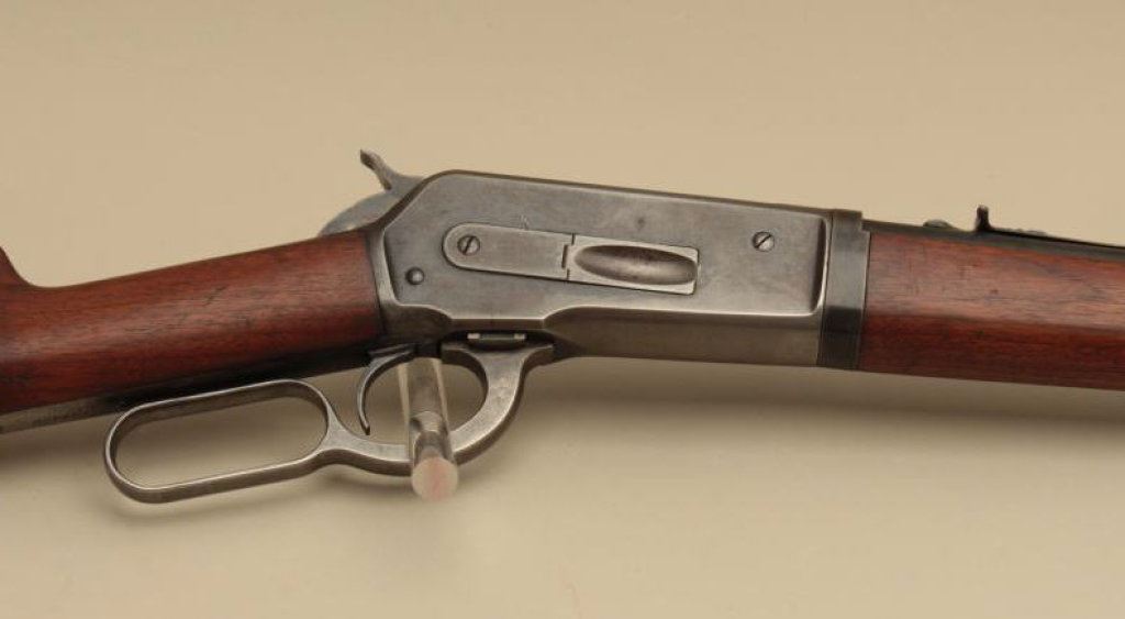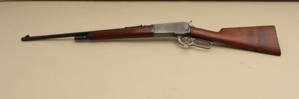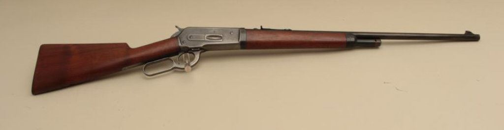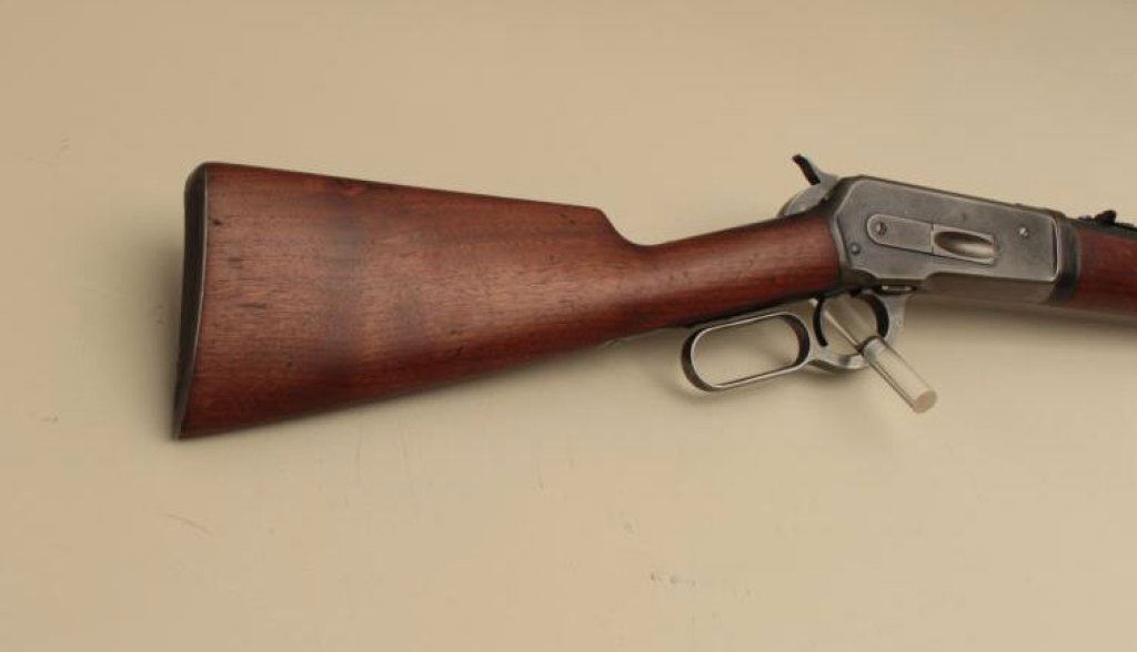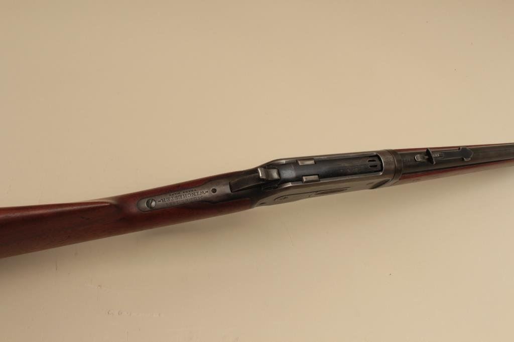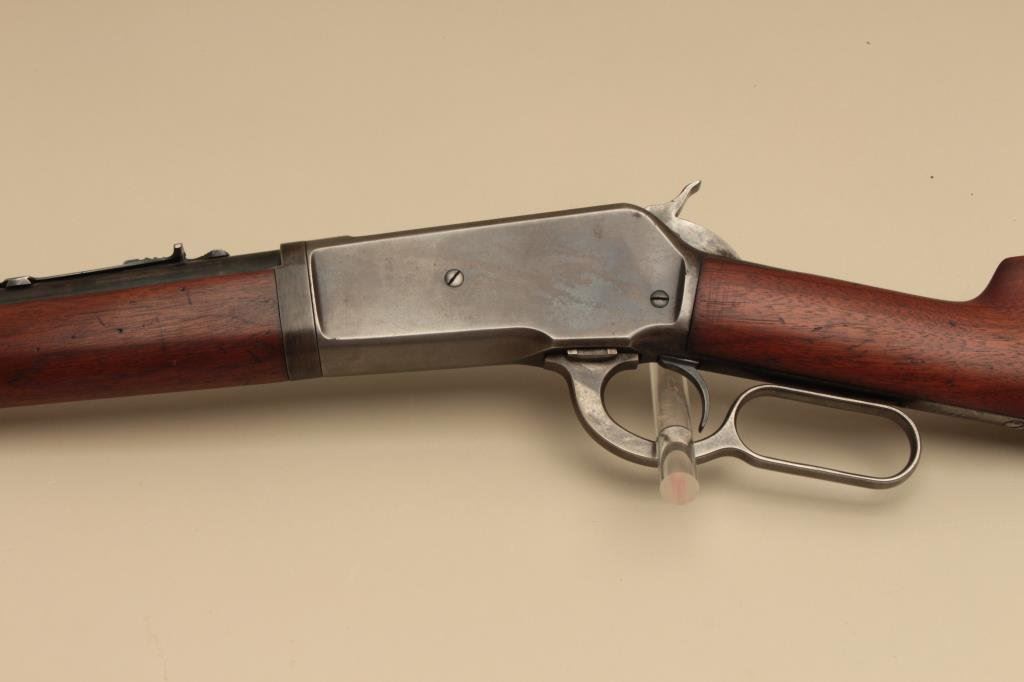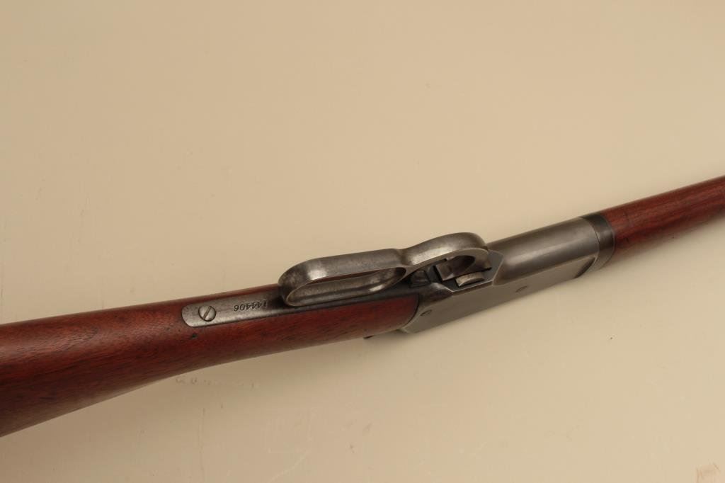 Serial #144406. The rifle is in good overall condition with a 24” barrel. The barrel and half magazine retain a significant amount of flaking blue finish. The receiver shows blue in the protected areas and on the bolt with old, muted case hardening on the hammer and lever. The smooth wood stocks are in good condition with mars and compressions from carry and use. The butt ends with a checkered steel butt plate. The bore is good, the action crisp and markings are legible. (C+R). Est.: $1,200-$2,400.