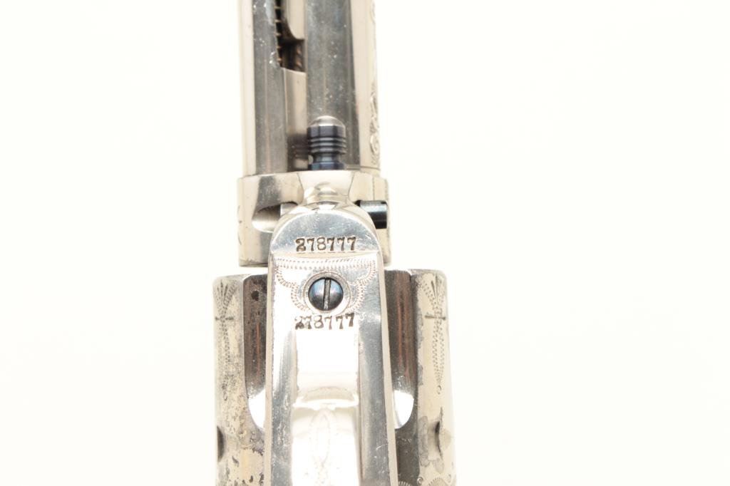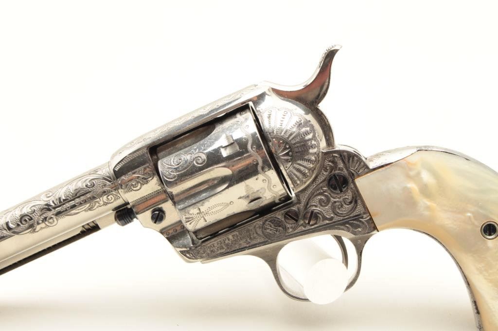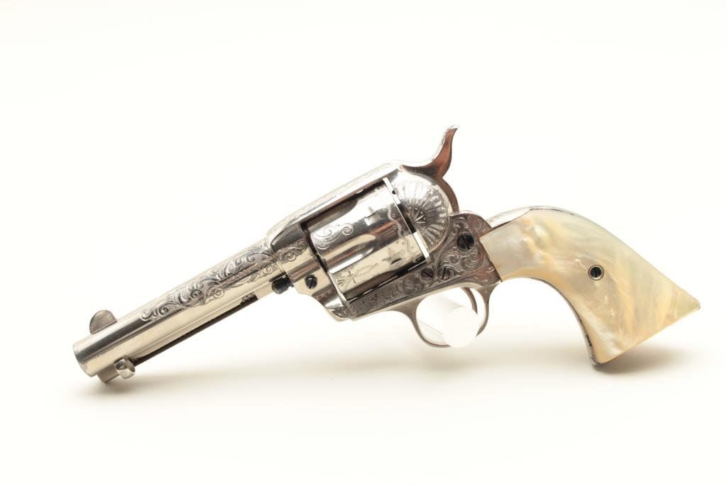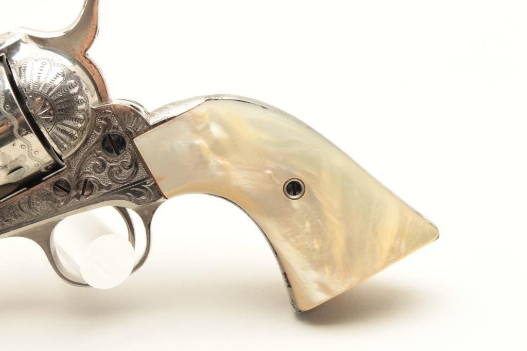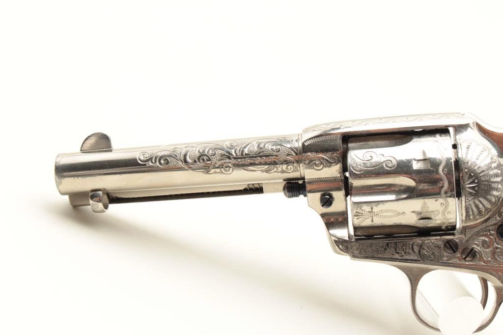diamond eye, S/N 278771. Factory letter confirms factory engraved, nickel finish, .45 caliber with 4 ¾” barrel, shipped to H&D Folsom Arms, New York, New York, June 18, 1906 with 1 gun in shipment. This Colt remains in excellent original condition retaining the majority of its original finish. Very slight aging and 95%-98% plus estimated original nickel. Crisp and sharp edges and markings. The grips are not listed but definitely period and possibly supplied by Folsom. The grips are beautifully carved and fit well with iridescent rainbow hues with quality carving. The eye is set with a small diamond in jeweler made gold bezel. The bore is bright and the front sight is its unaltered and full original heights. A 9 plus on a 42745 collector’s scale from a award winning Colt collection. (C&R/No PPT) Est.: $40,000-$80,000