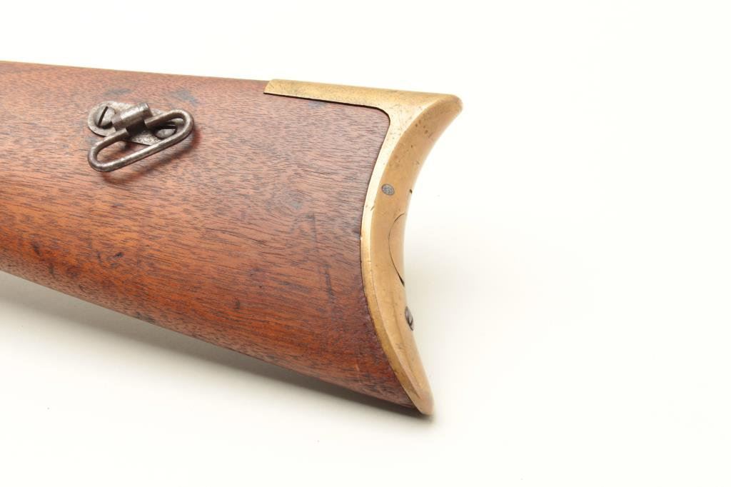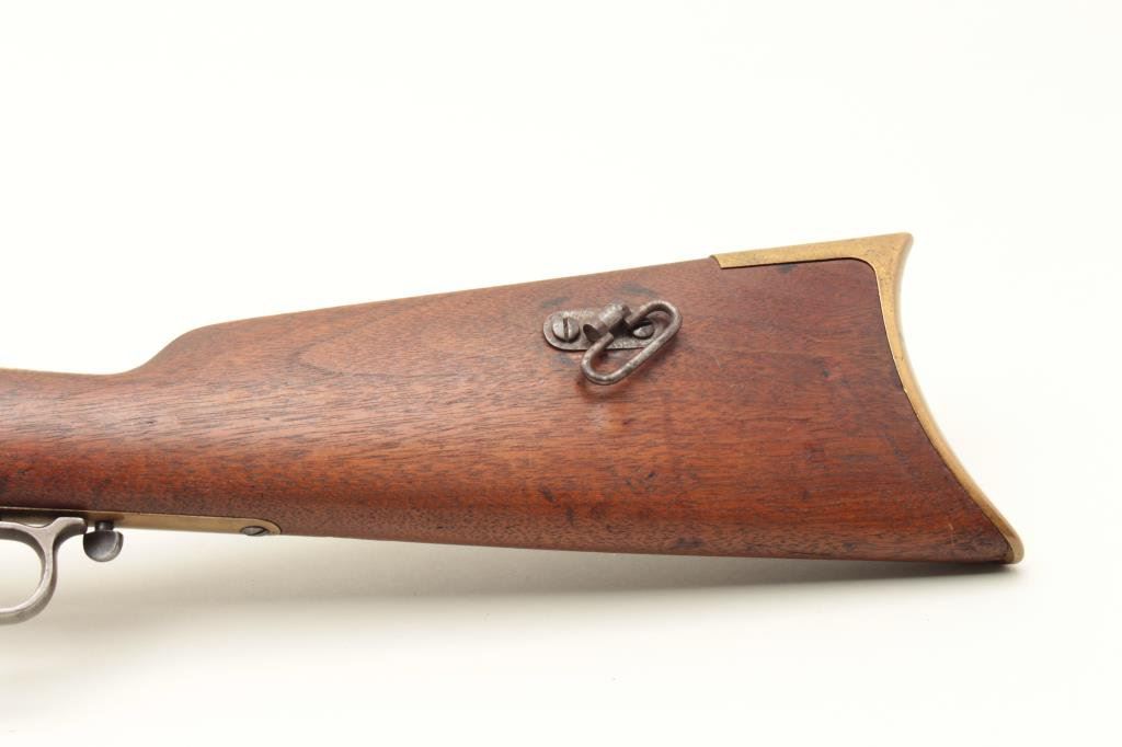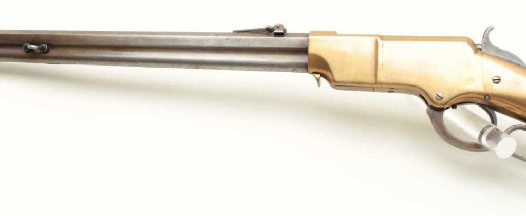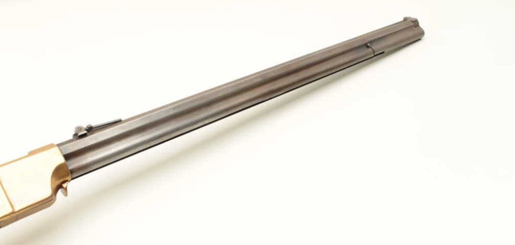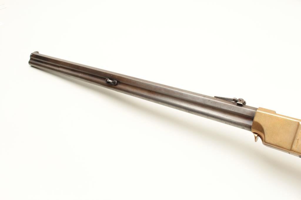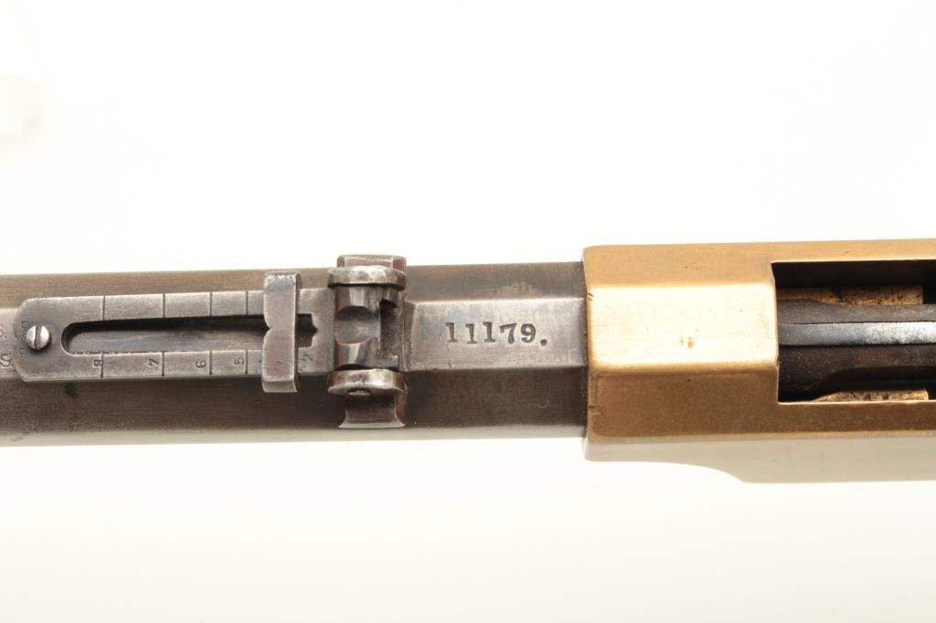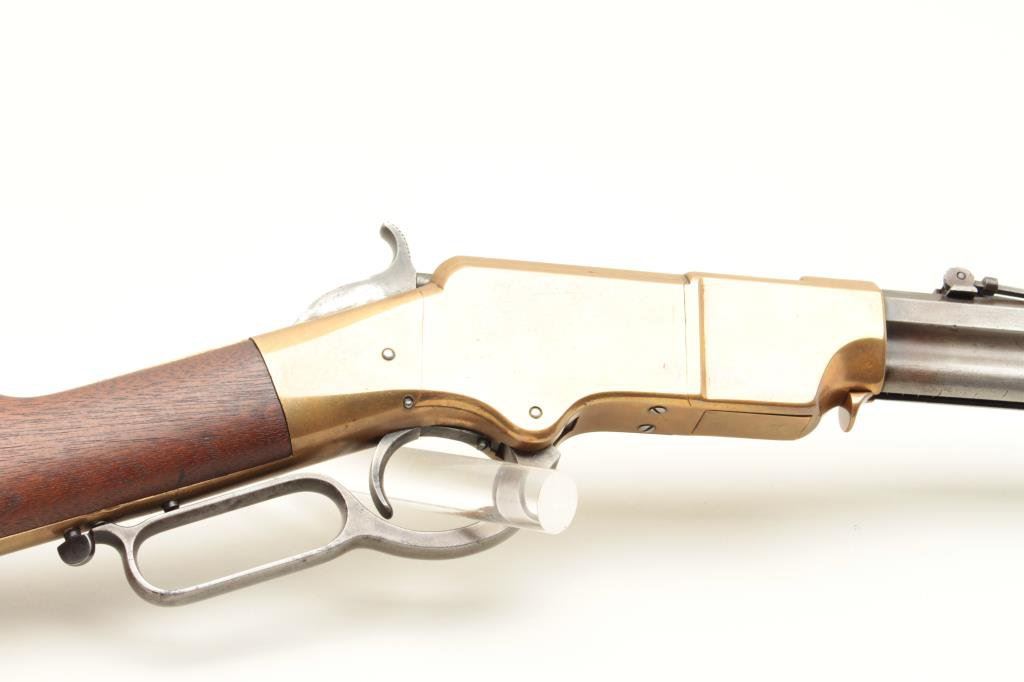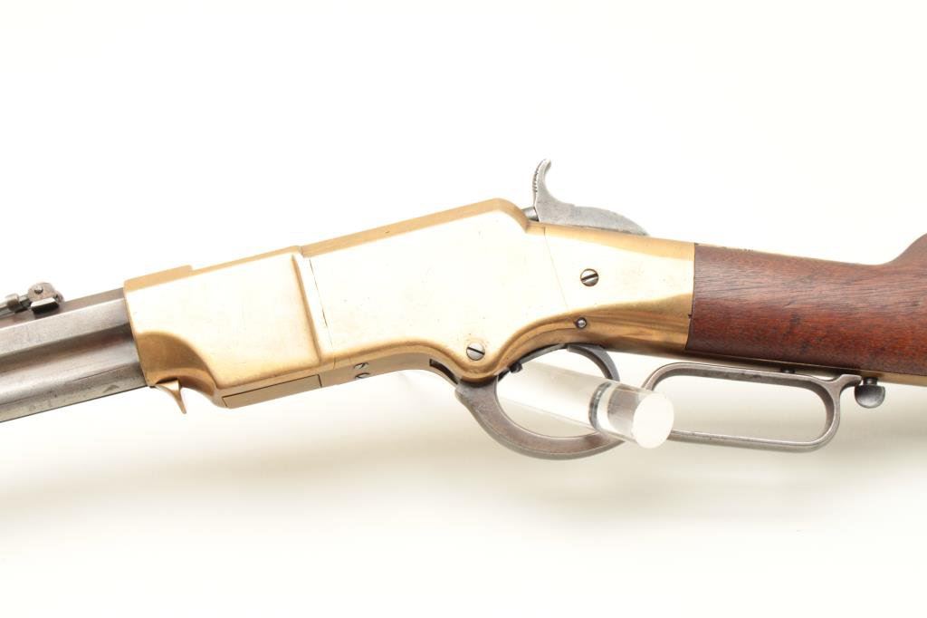 Serial #11179. The rifle is in very good overall condition with a 24” octagon barrel. The barrel has gone almost entirely to a grey patina with some blue still visible in the protected areas, specifically under the rear sight and just in front of the receiver and at the muzzle. The edges remain sharp with clear barrel address and patent marks. The brass receiver has a light patina with small mars. The hammer and lever show old, muted case hardening with some knackering at the base of the elevator. The smooth wood butt stock is in very good condition with small mars and compressions consistent with use and carry. The buttstock ends with a smooth brass butt plate with trap. The sling swivels are both present. The bore is good, the action crisp and markings are sharp on this most desirable Henry. (Antique). Est.: $12,500-$25,000.