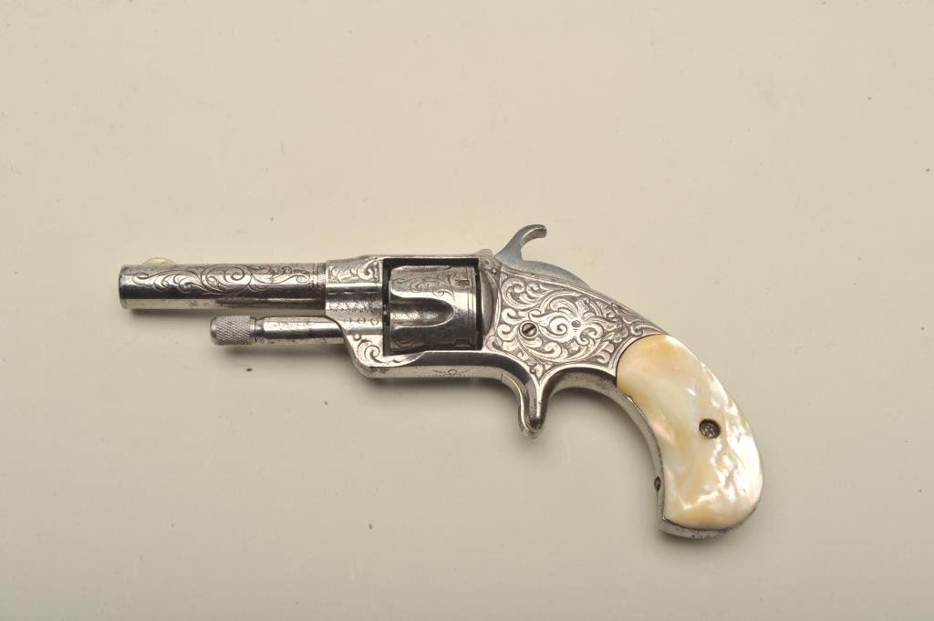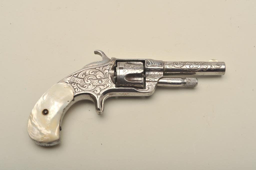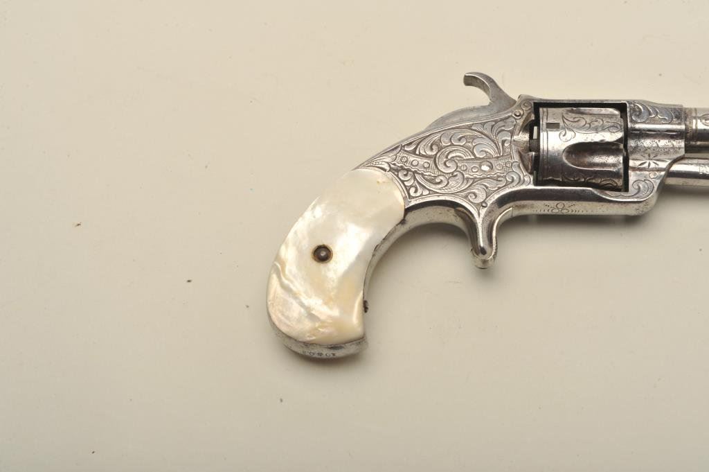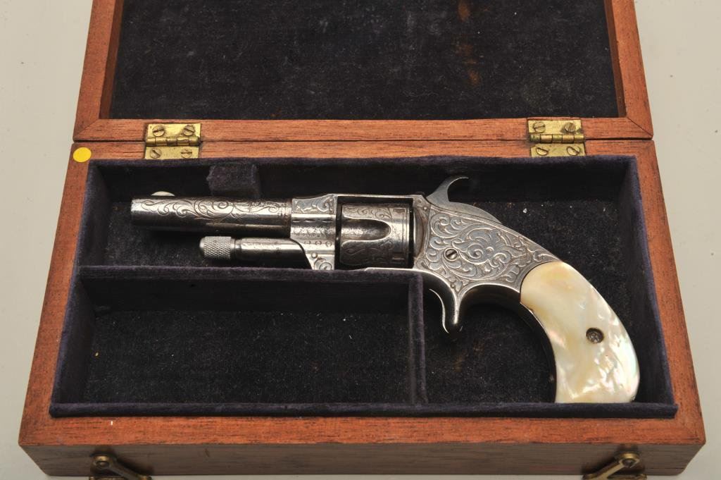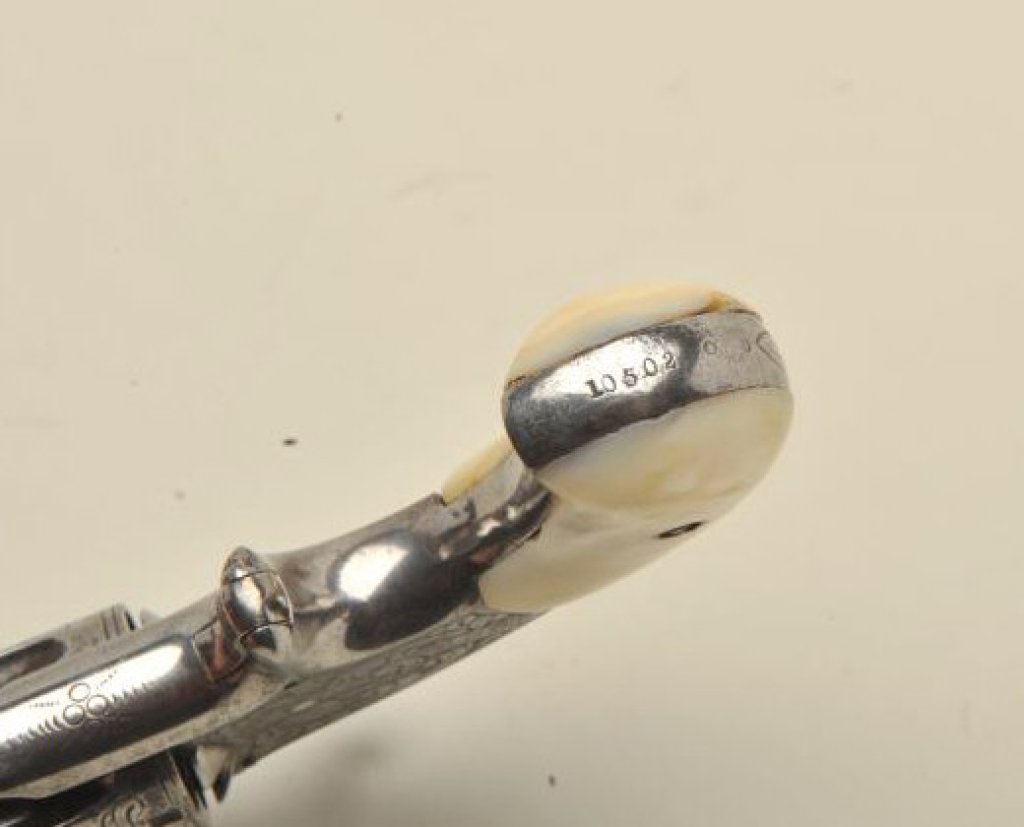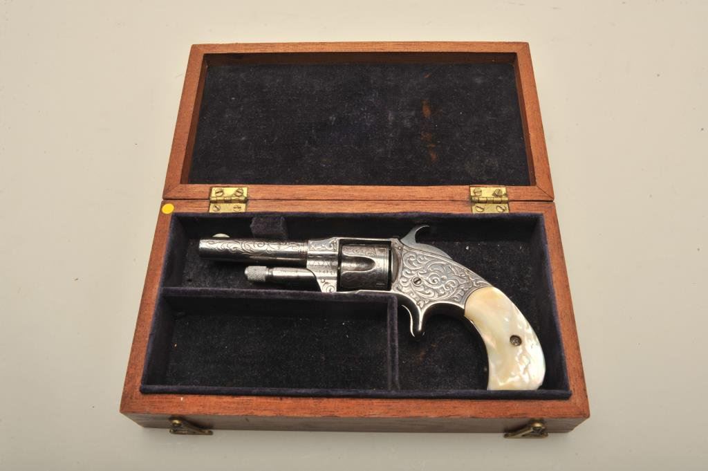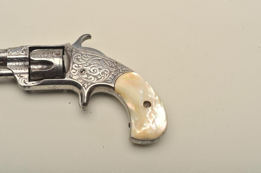 round barrel, pearl grips, S/N 10502, in overall good to very good condition with a crisp action, extensive coverage of engraving, beautiful iridescent pearl grips; contained in a wood presentation casing with purple lining. (Antique). Est.: $1,000-$2,000.
