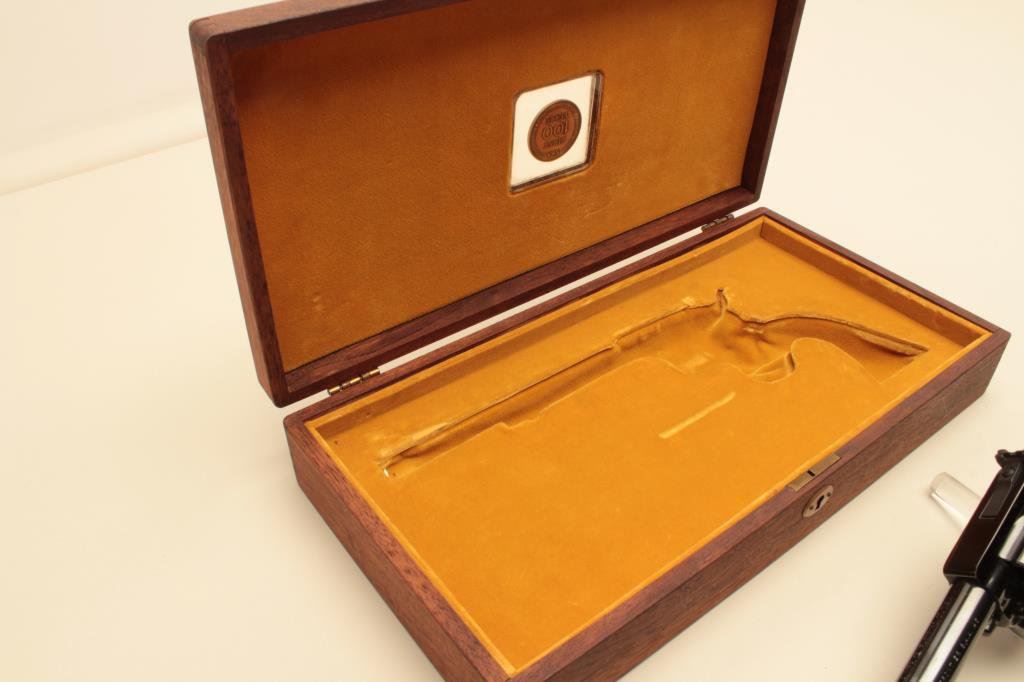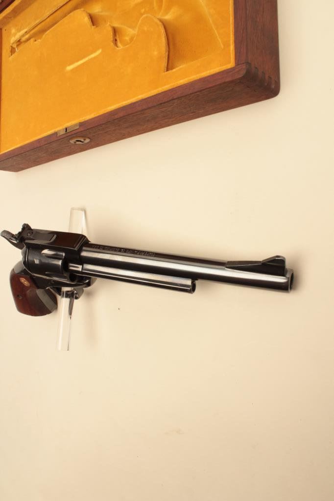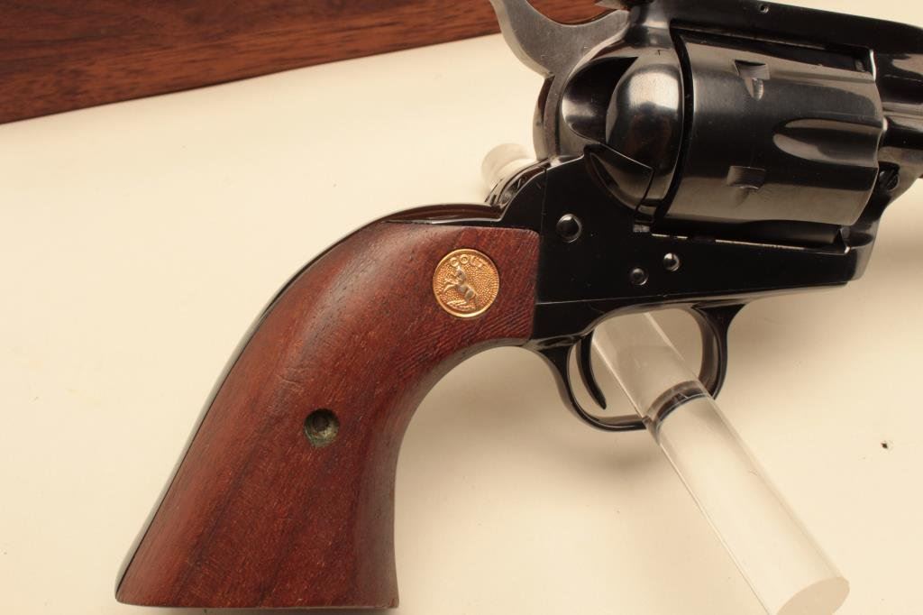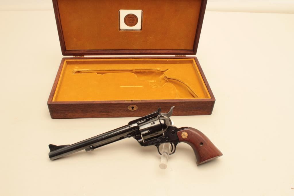 pistol is in fine overall condition showing only light storage marks. The pistol features a 7 ½” barrel which retains nearly all of its high polish blued finish. The smooth wood gold medallion grips are in excellent condition with only light handling marks. The pistol comes with its gold velvet lined commemorative wood display box with the Colt emblem and an NRA 100 year’s Centennial medallion inlayed in the lid of the case. The case and lining are in good condition. Est.: $700-$1,400. (Modern).