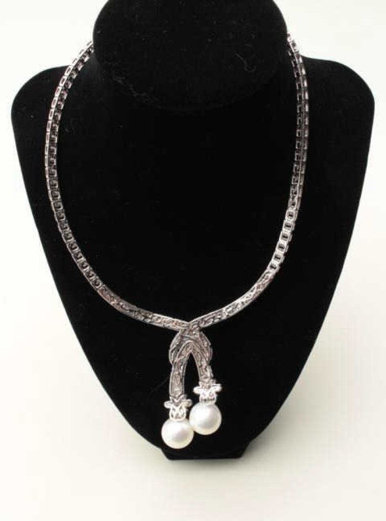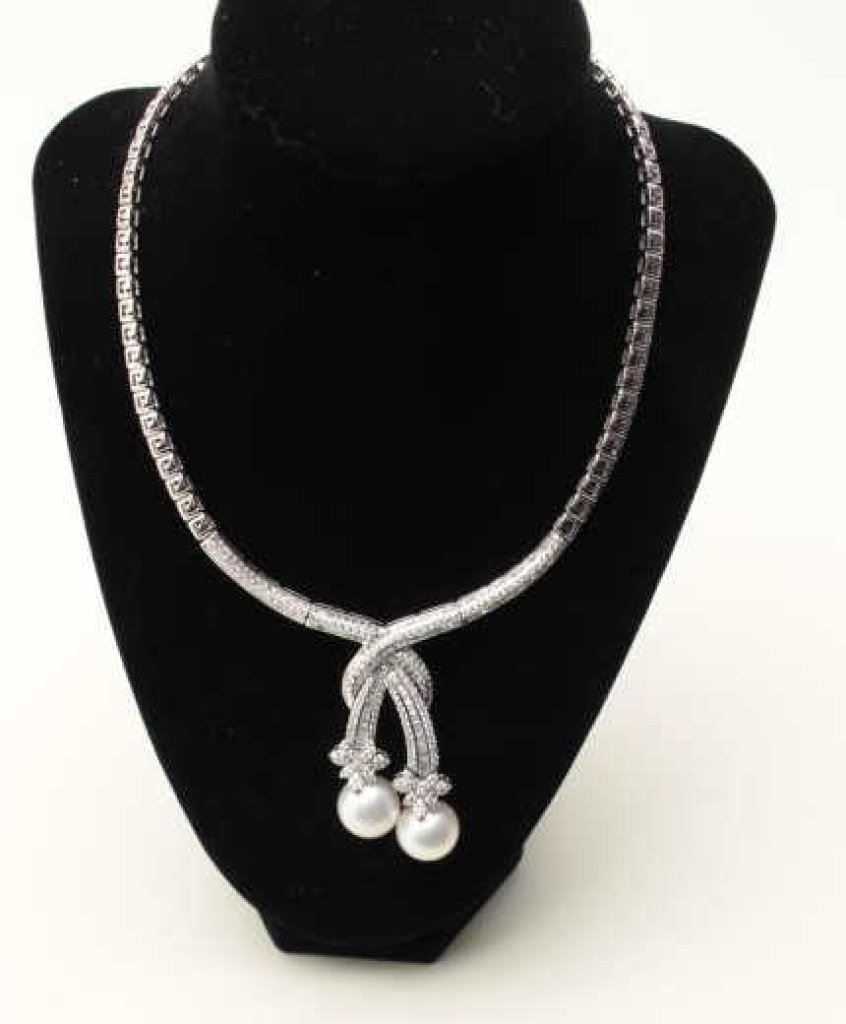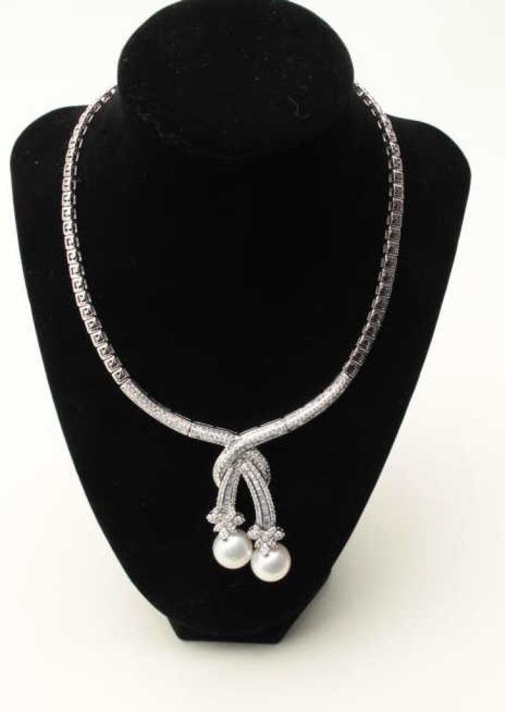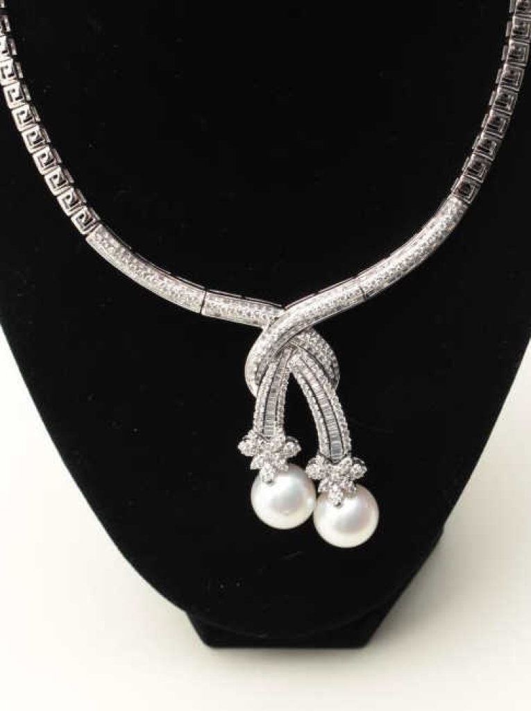 carats of Diamonds (approx. 8 carats round cut and 3 carat baguette cut.) set with 2 South Sea Pearls approx. 15.5 mm each. Est:$10,000-20,000.