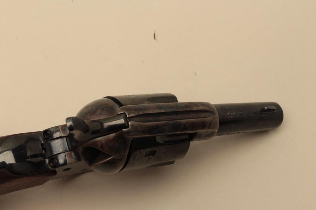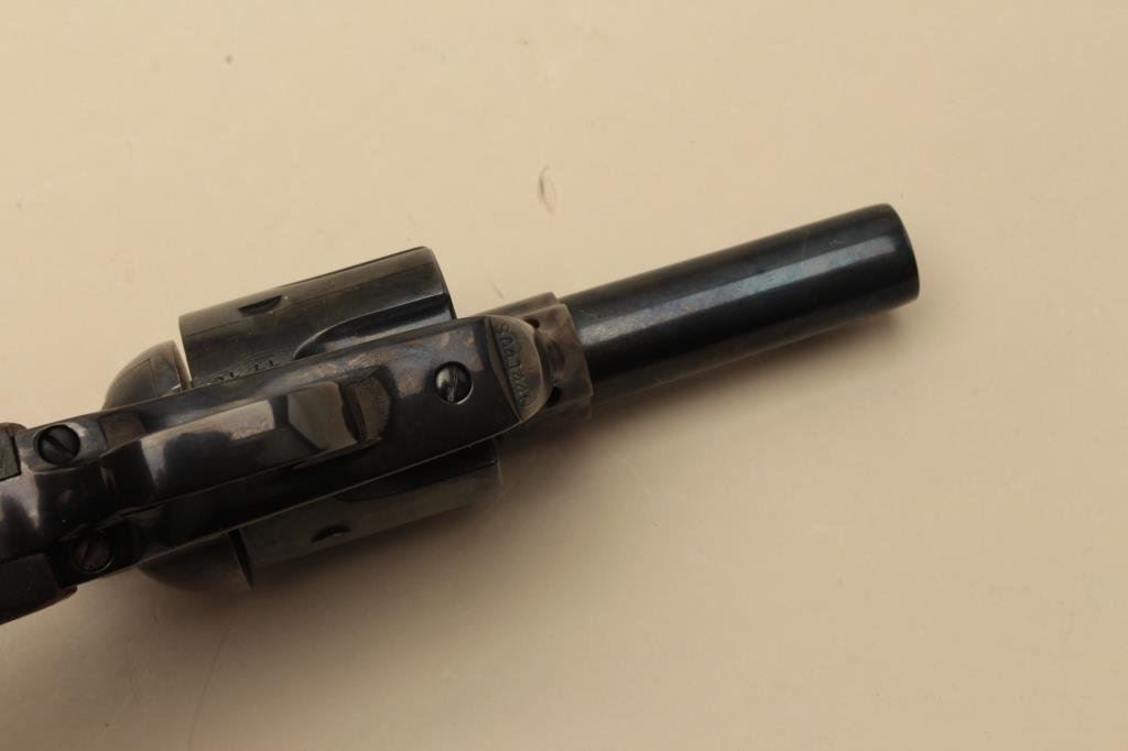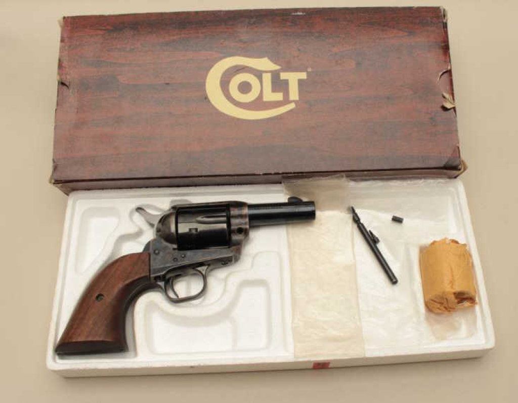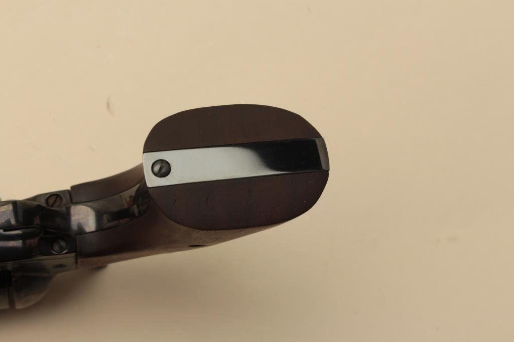 pistol is as new in the factory wood grain cardboard box with a 3” barrel. The pistol is blue and case hardened with only light handling marks noted. The smooth grips are in excellent condition. The pistol includes a second cylinder, manual and assorted packaging materials in the box. The box shows wear at the corners and edges but is otherwise in good condition. Est.: $800-$1,600. (Modern).