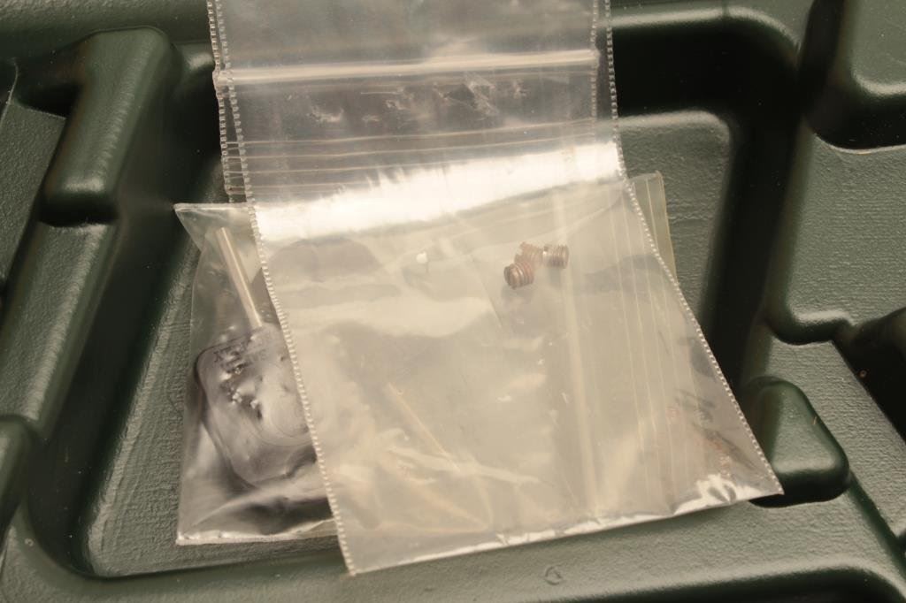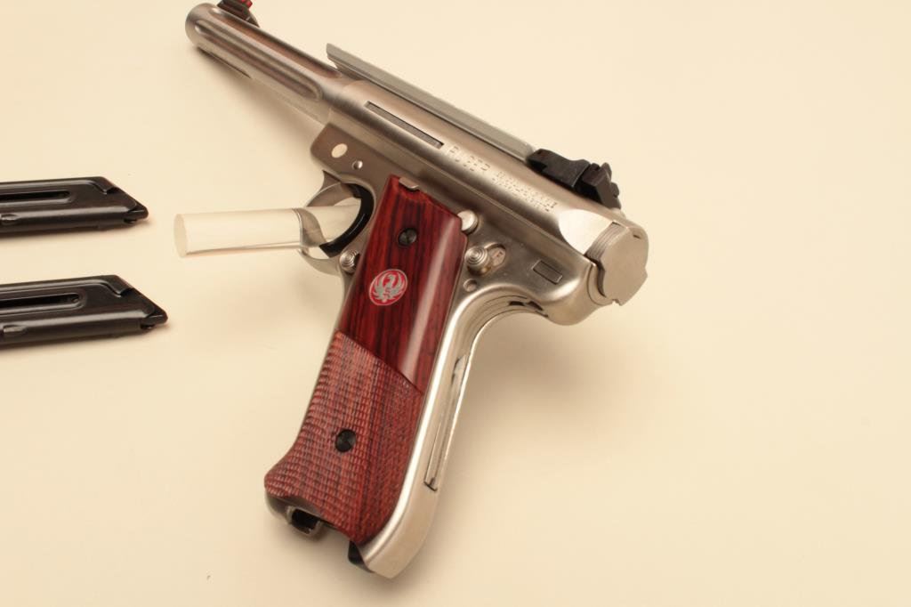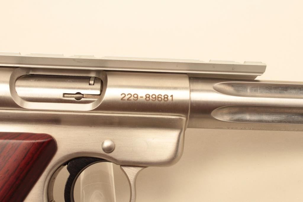 fluted barrel, scope rail, stainless, checkered wood red medallion grips, S/N 229-89681, with factory green hard carry case, one extra magazine, instructions and extra front sight inserts; like new condition showing little use or handling. (Modern/PPT). Est.: $250-$500.