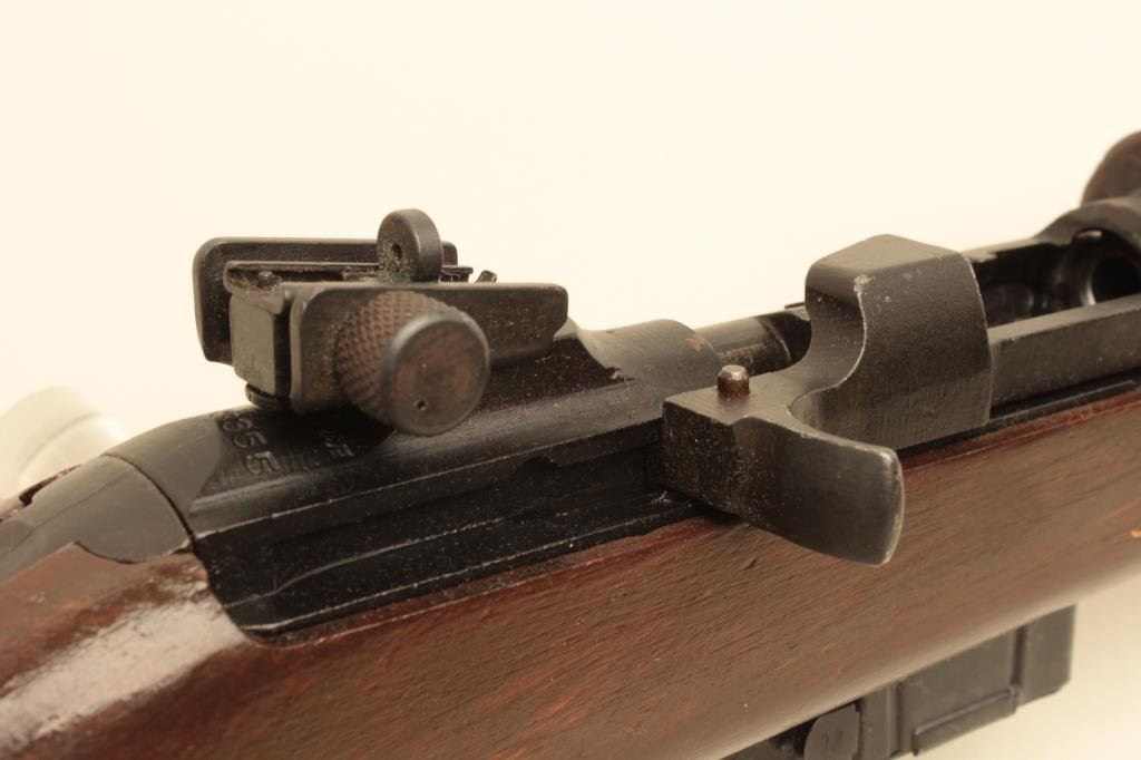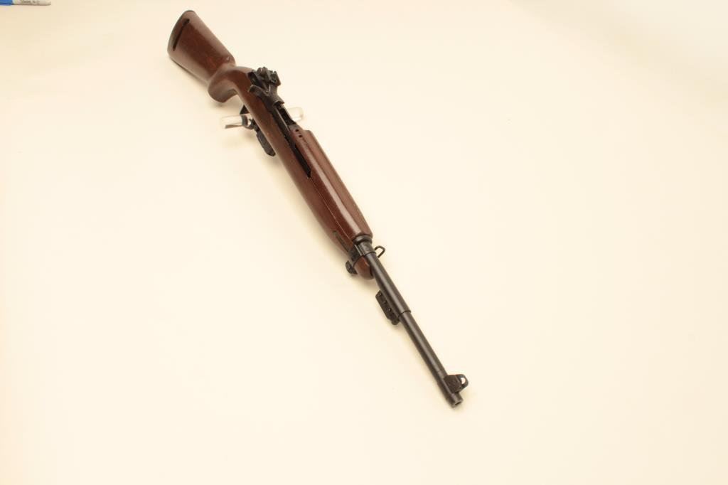 in good overall condition as re-built. The carbine features an 18ā IBM marked barrel with bayonet lug. The barrel and receiver retain the majority of an arsenal quality re-finish. The smooth wood military stock has been sanded and given a coat of dark varnish. A Crossed Cannons cartouche is still visible on the right hand side of the butt as well as a large āJā in the sling well. The bore is good, the action crisp and marking s are sharp on this carbine. The lot includes a correct magazine. $300-$600. (C+R).