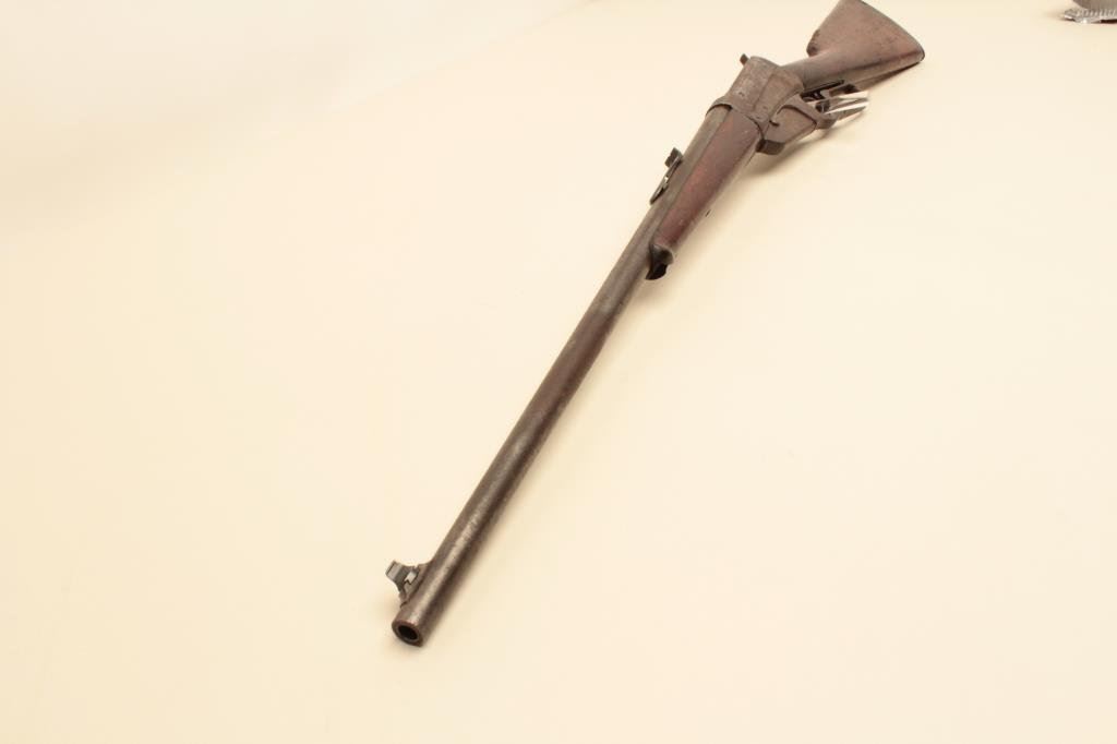 caliber, 24” round barrel, blued finish with dark patina and scattered erosion on metal surfaces, wood stocks, S/N 58791, front and rear sights changed, good action, fair + bore, weathered and worn stocks with front ebony insert on forend missing; purportedly an English tiger Hunting gun from India. (C&R). Est.: $400-$800.