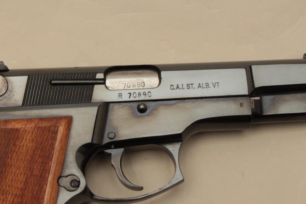 pistol is in very good overall condition with a 4 ½” barrel. The pistol retains nearly all of its polished blue finish with only light handling marks noted. The pistol is import marked on the slide. The checkered wood grips are in very good condition showing only storage marks. The bore is very good, the action crisp and markings are sharp on this Hungarian pistol manufactured on the Hi-Power design. The lot includes one correct magazine. Est.: $300-$600. (Modern).