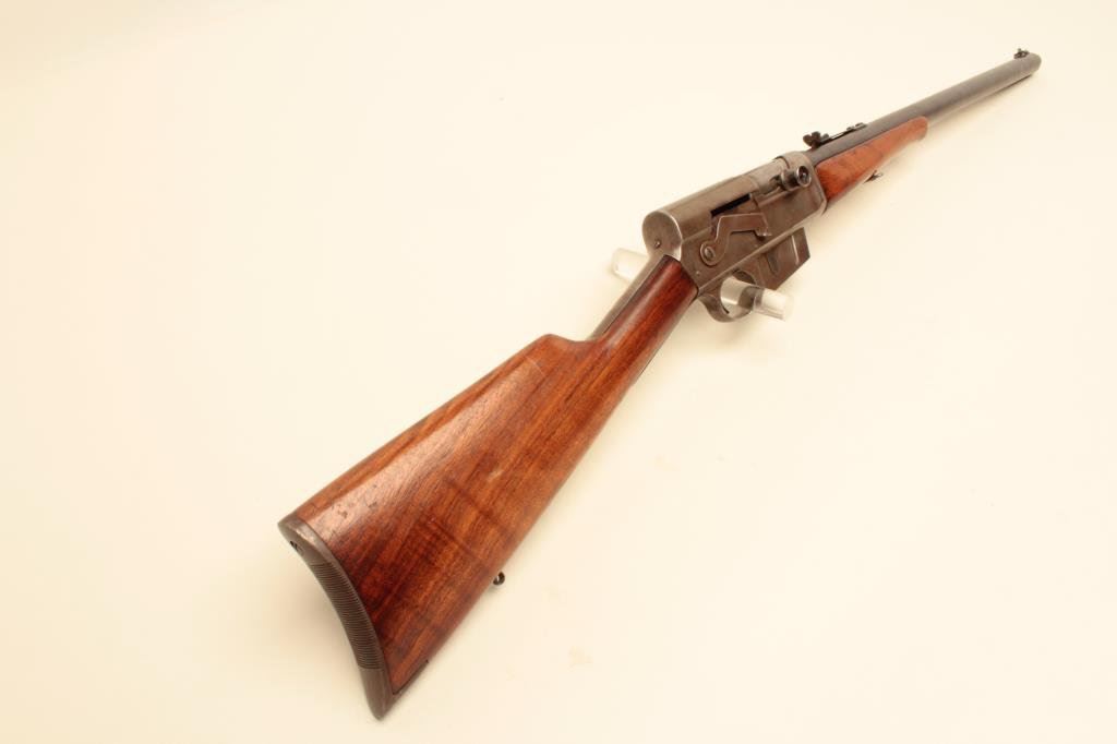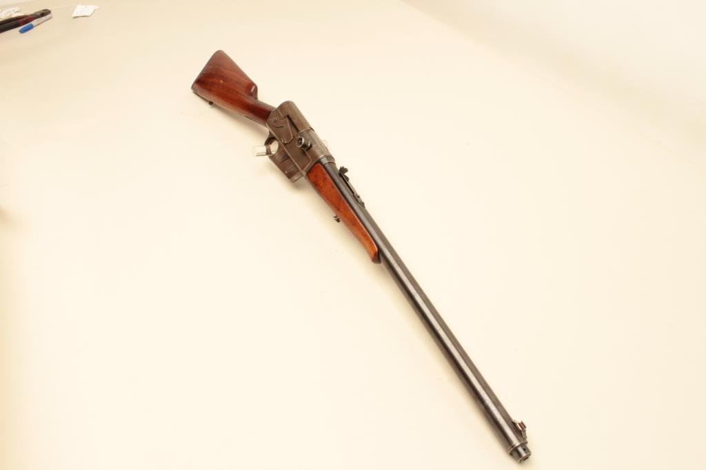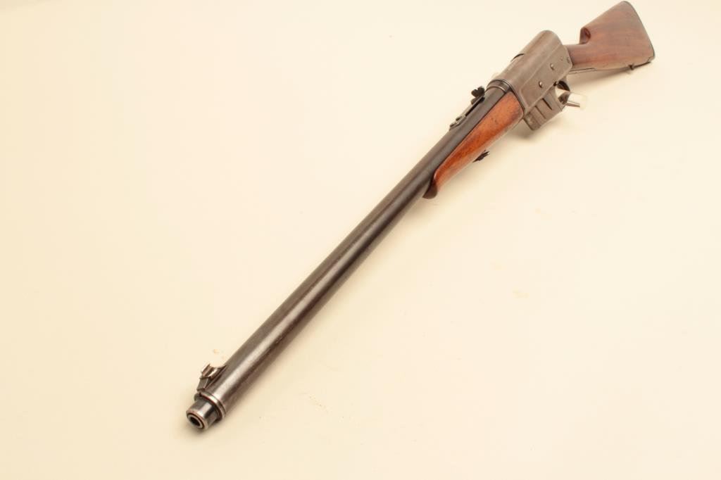 The rifle is in good overall condition with a 22” barrel. The barrel retains the majority of its toning blue finish with small scratches, wear at the muzzle and a missing screw on the underside. The receiver has taken on a grey patina with little to no finish remaining. The smooth wood stocks are in good condition with small compressions and scratches consistent with field use. The butt stock ends with a steel butt plate. The bore is good, the action is crisp and markings are sharp. Est.: $200-$400. (C+R).