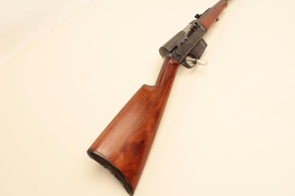 (first year of production). The rifle is in very good overall condition with a 22” barrel. The barrel and receiver retain the majority of what appears to be an old application of cold blue. The smooth wood stock is in very good condition as re-finished. The butt stock ends with a Remington marked plastic butt plate. The bore is good, the action is crisp and markings are sharp on this early Model 8 Est.: $300-$600. (C+R).