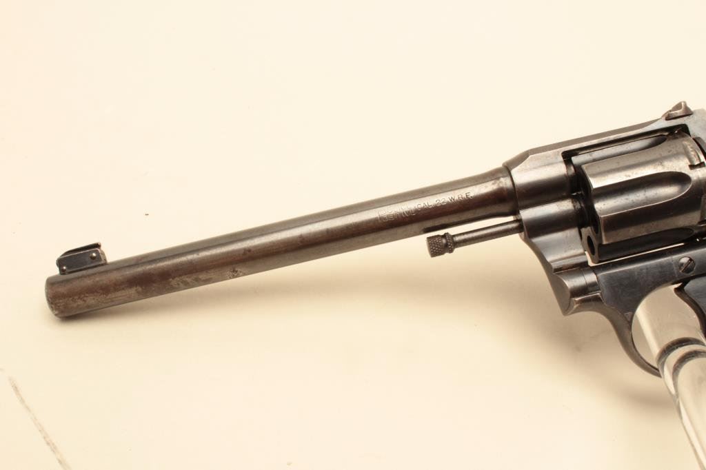 blued finish, checkered wood medallion grips, S/N 24111, in overall good condition with considerable original finish on frame and cylinder; barrel shows traces of original blue in protected areas with scattered spots of pitting and erosion; good bore, crisp action and very good markings; grips show a large old chip at the bottom area of the left grip. (C&R/PPT). Est.: $400-$800.