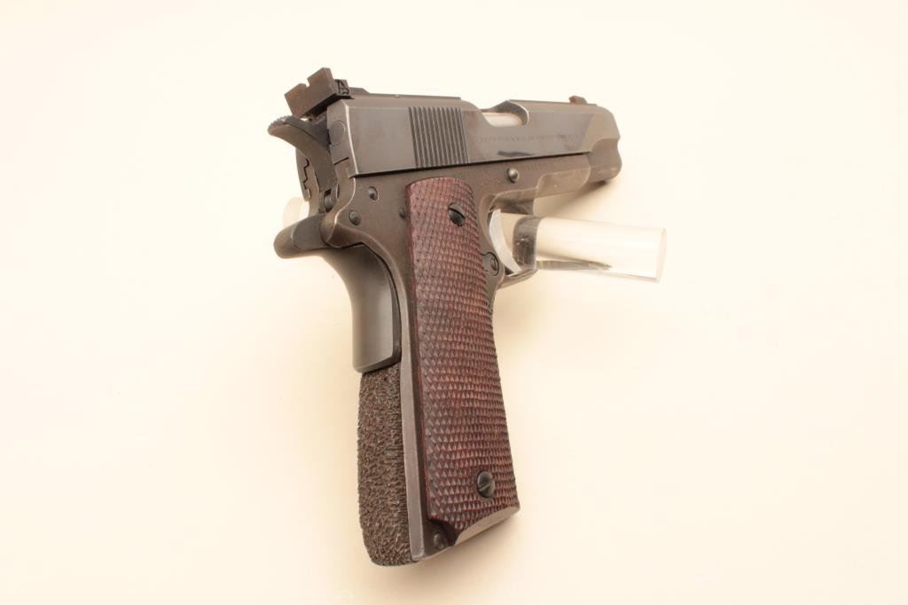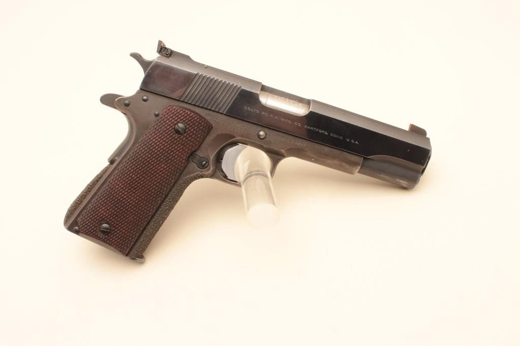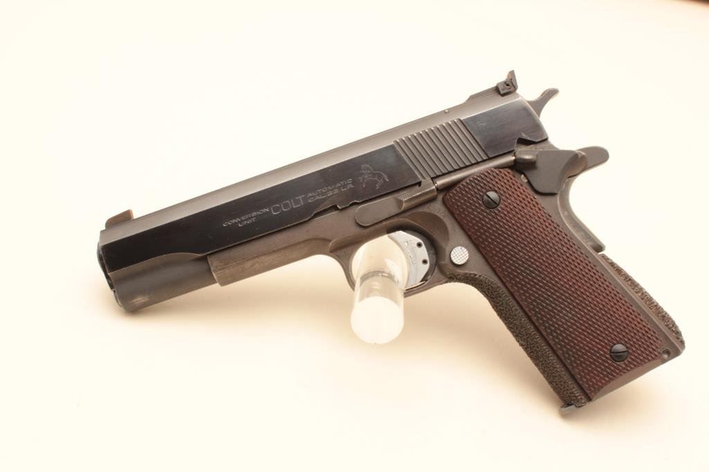 frame (S/N 2435321) and Colt .22LR Conversion Unit slide with .22LR barrel, parkerized frame, blued slide, checkered wood grips, stippled grip straps, trigger shoe marked “A.F Behlert/Cranford, N.J.” in overall very good to near fine condition with a near fine bore, sharp markings, good action and majority of finish remaining; very good to near fine grips; purportedly U.S.M.C. (C&R/PPT). Est.: $800-$1,600.