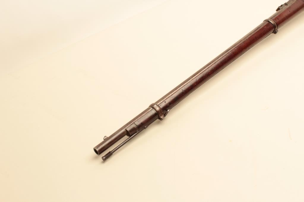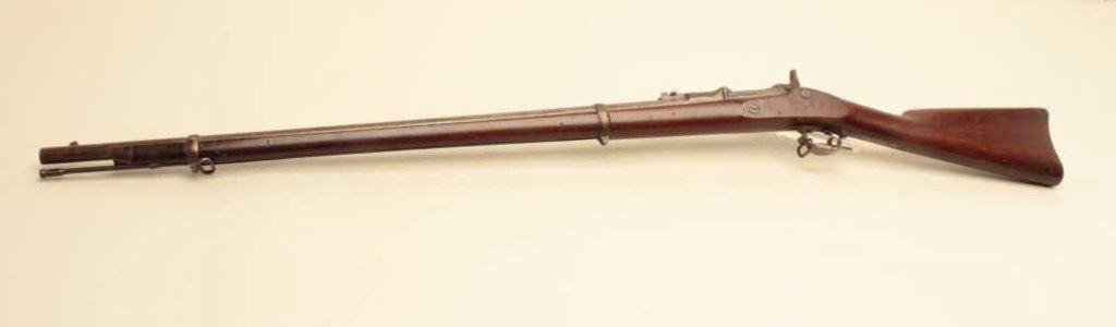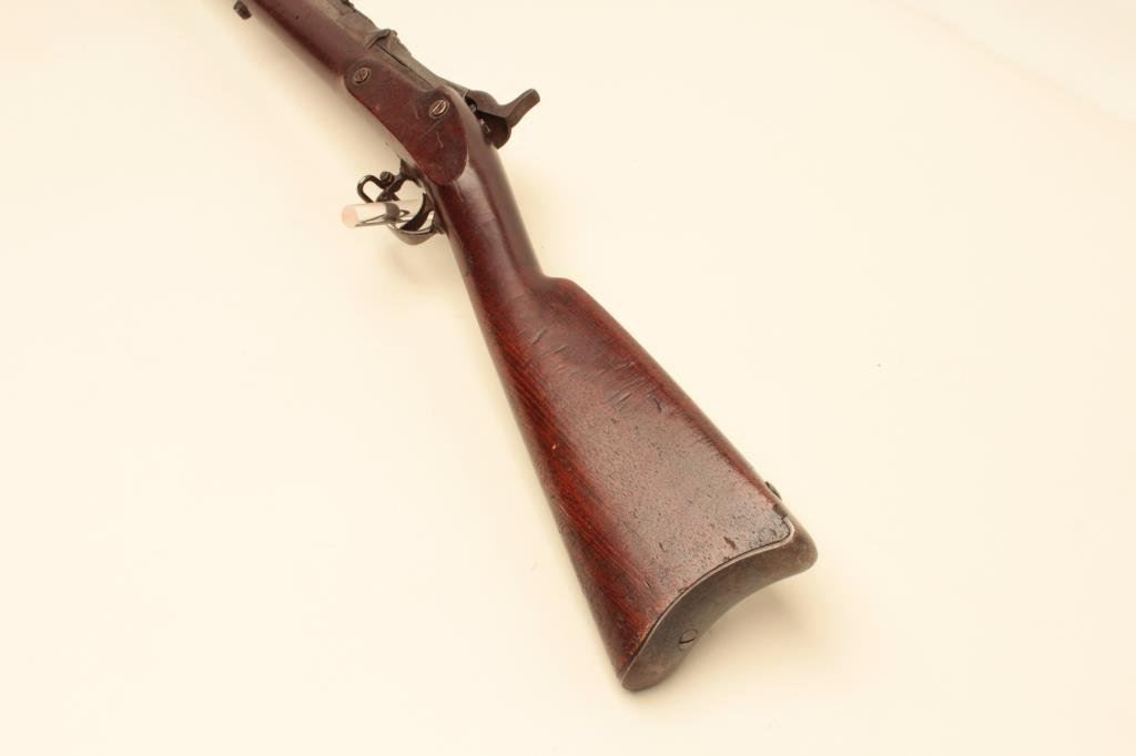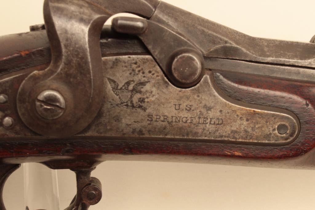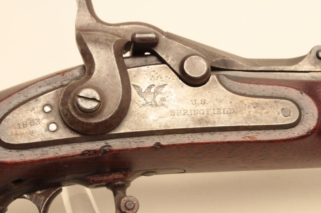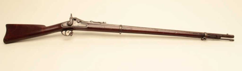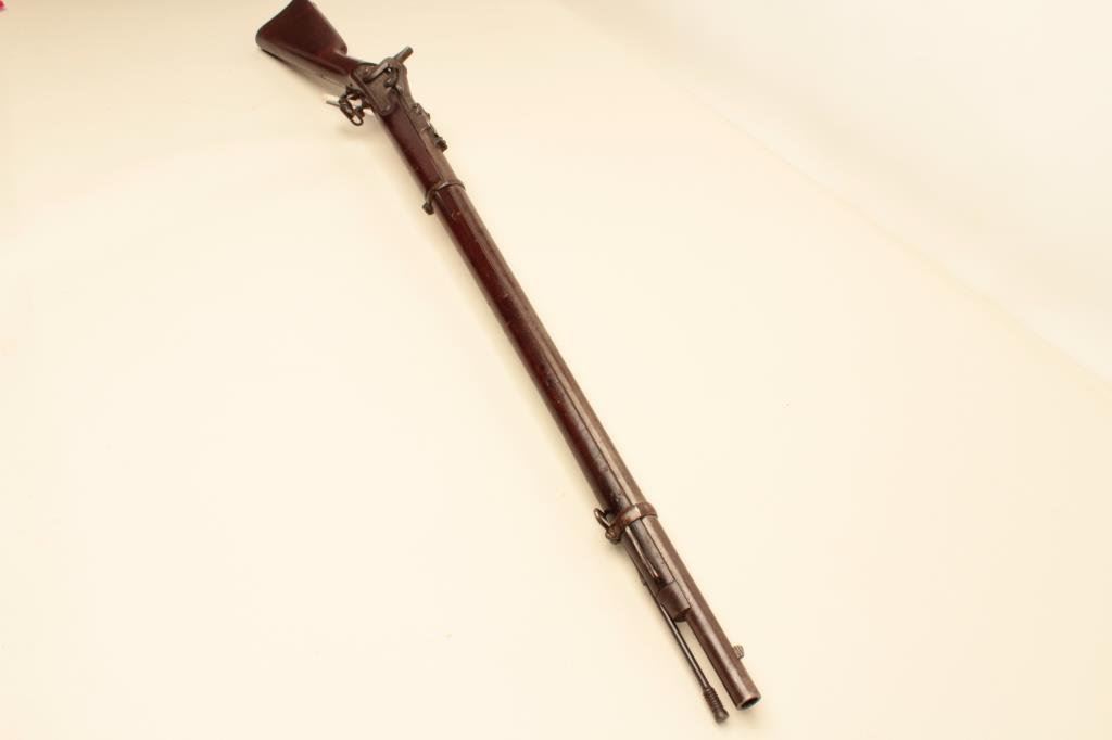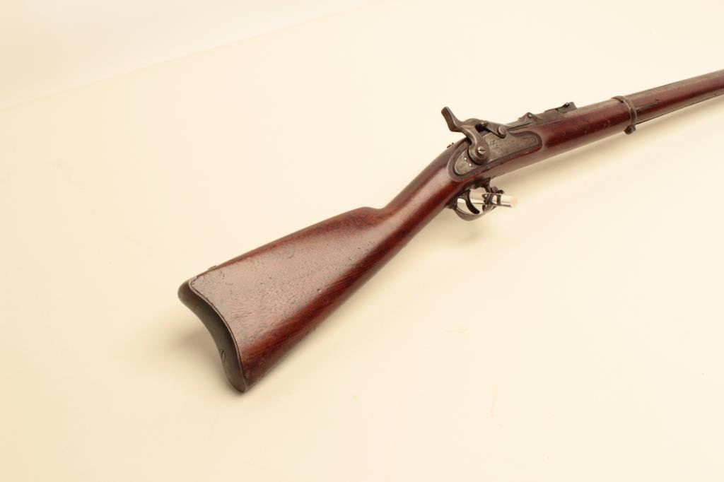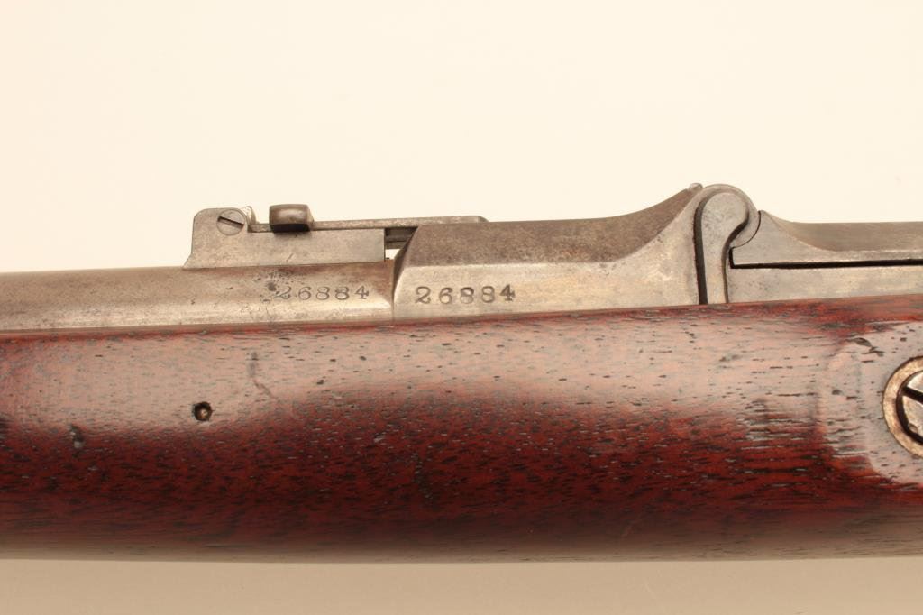 wood stock, 1863-dated lock plate, 1869-dated “trapdoor”, S/N 26884 (on left side of barrel and receiver at breech); in overall very good condition with a very good bore, crisp action, sharp markings and very good wood overall showing remnants of inspector’s cartouche on left side of stock above the trigger. (Antique). Est.: $600-$1,200.