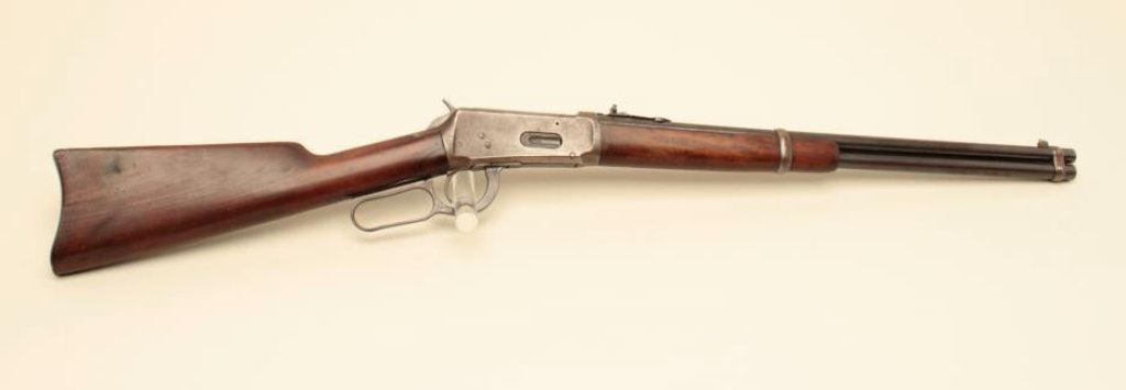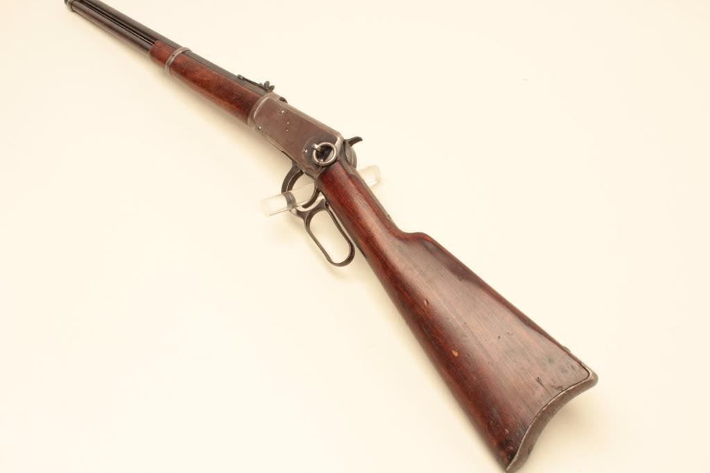 to very good condition with original blue on barrel and tube; 20-30%drifting blue; minor pitting mostly on tube; wood good with a hairline crack on the right side of the wrist; action good and bore is very good; hard to find caliber in the saddle ring carbine. (C&R). Est.: $800-$1,600.