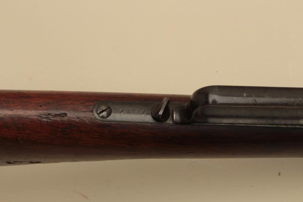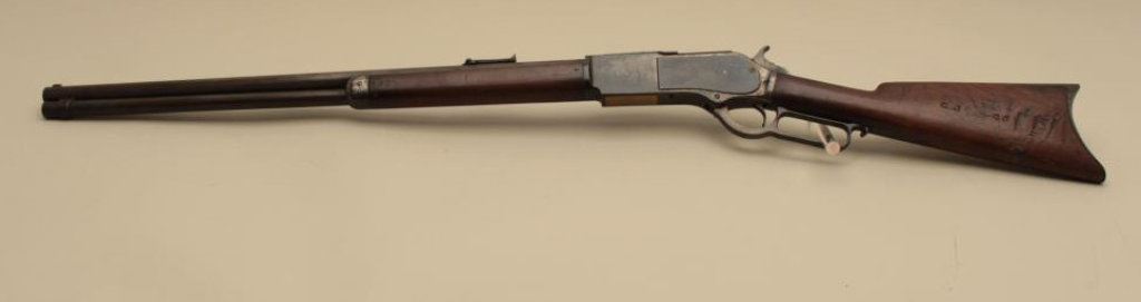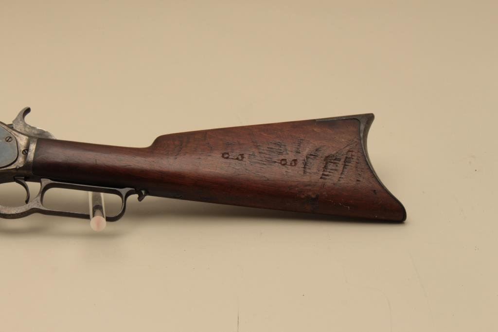 to 25.5”, blued finish, wood stocks, S/N 18421, grey patina to metal surfaces with area of pitting at muzzle, working action, bore is fair only, wood shows old marring particularly to left side of butt stock with old stamped initials “C.J.” on both sides of butt stock and on the right front side of the receiver. (Antique). Est.: $800-$1,600.