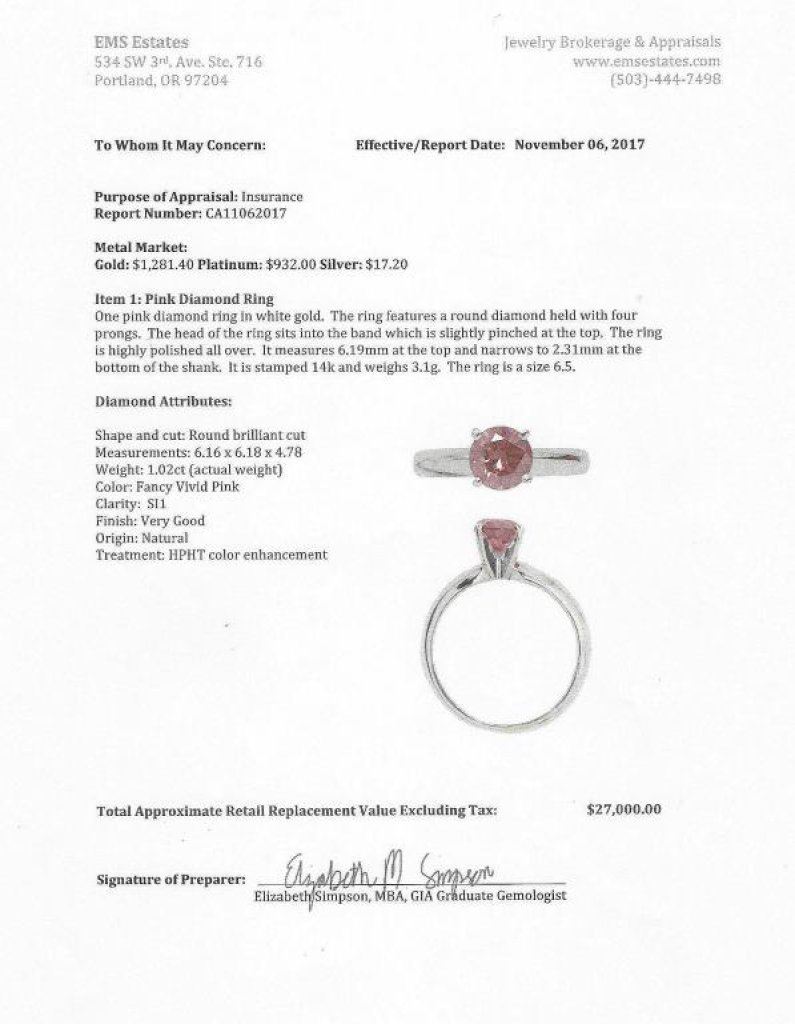 in a 14 karat white gold solitaire setting. Full Retail Appraisal at $27,000.00 Est:$8000- 12,000 Cheapest on line price is between $10,000-14,000