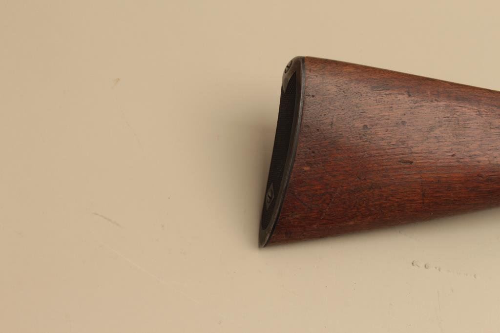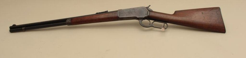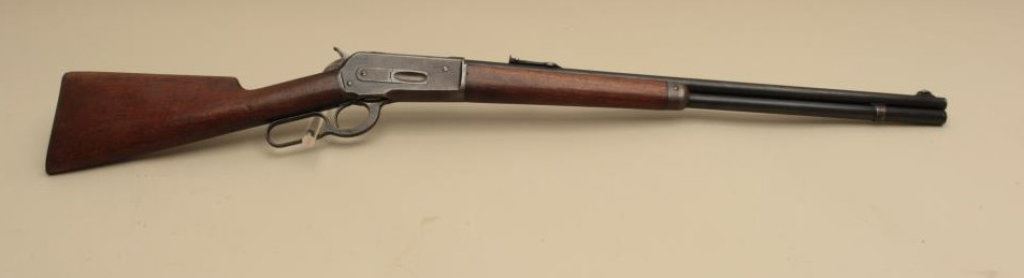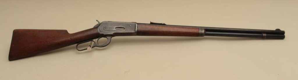 round barrel, blued finish, wood stocks, S/N 138554, in overall good condition with considerable muted original blued finish remaining, crisp action, good markings, overall good wood with checkered steel shotgun butt plate, top tang screw missing; bore shows scattered light pitting; may clean to better. (C&R). Est.: $800-$1,600.