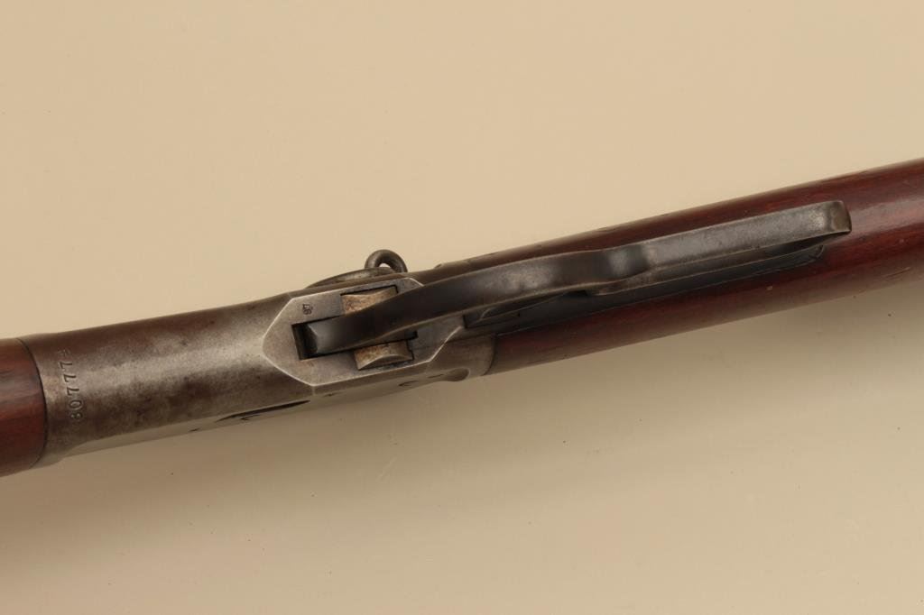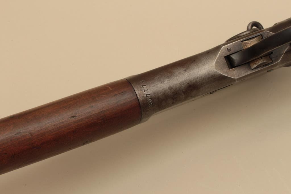 barrel, blued finish, wood stocks, S/N 807774, in overall very good condition with the majority of its original blued finish on the barrel and loading tube and a grey patina to the receiver, very good bore, crisp action and markings, very good wood stocks with scattered old mars and scratches from carry and storage. (C&R). Est.: $700-$1,400.