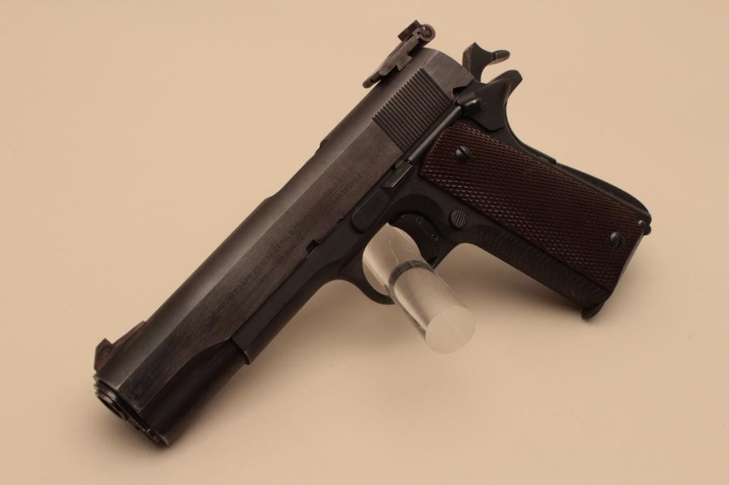caliber, 5” barrel, mat black finish, checkered brown grips, Elliason adjustable rear sight, S/N 921829 with “0893” stamped on right side of slide below ejection port, added trigger shoe; in overall good to very good condition displaying the majority of its finish, hand checkered front grip strap and rear grip safety; very good bore, good markings and fine grips; action is not working and in need of attention by a competent gunsmith. (C&R/PPT). Est.: $1,400-$2,800.