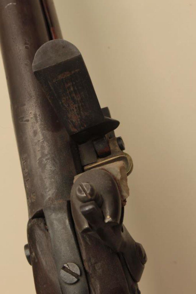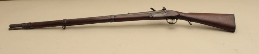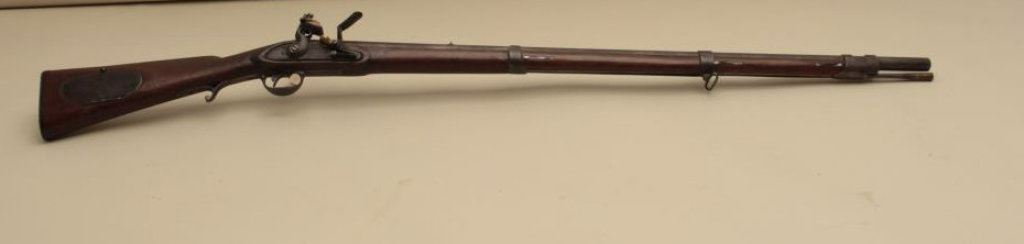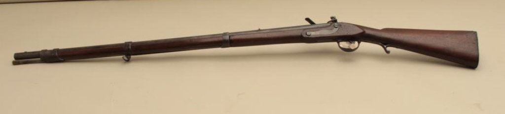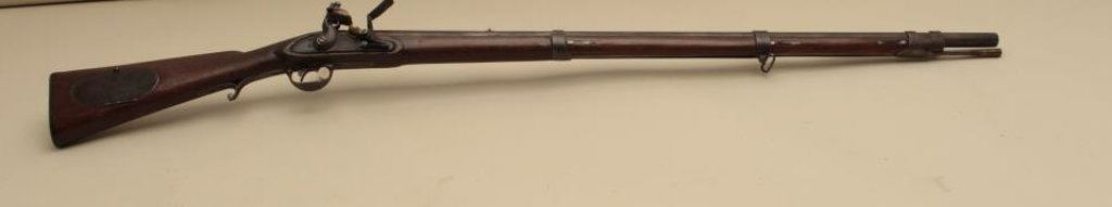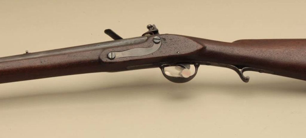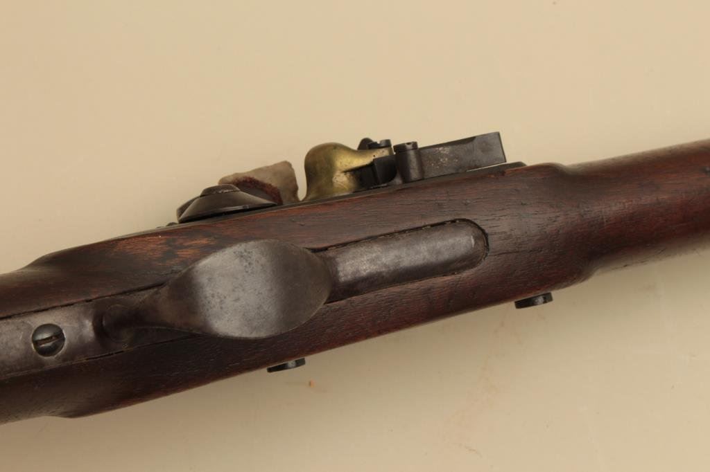 to flintlock, .60 caliber, 36” barrel, full length wood stock with iron oval patchbox, in overall good + condition displaying a dark patina to metal surfaces, working action, good markings, good wood; simple rear sight added long ago. (Antique). Est.: $1,000-$2,000.