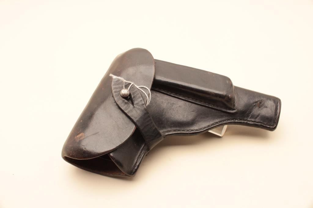 barrel, blued finish, checkered wood grips, no magazine, S/N 57804a, accompanied by a leather flap holster and magazine that are both incorrect for this pistol. The gun is in overall very good to near fine condition with majority of blued finish, some high point wear, very good to near fine bore, crisp action, sharp markings and very good grips; holster is good overall. (C&R/PPT). Est.: $800-$1,600.