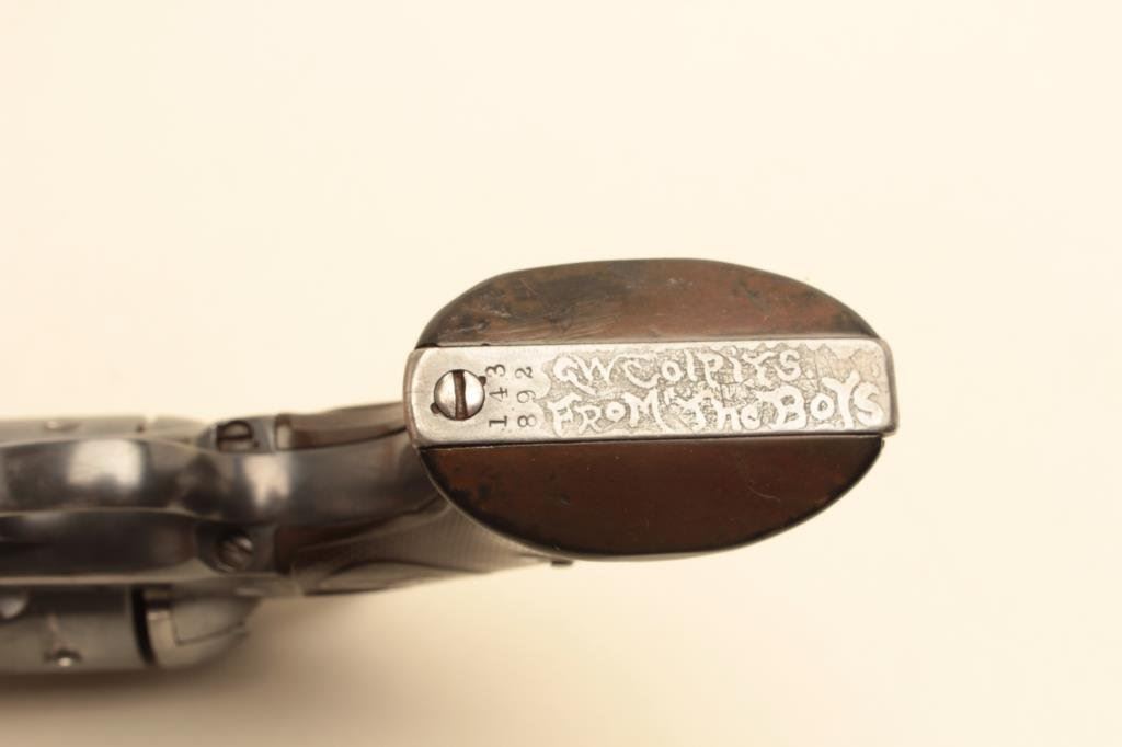barrel reduced to 5 ¼”, re-blued finish, hard rubber grips, S/N 143892. Good quality re-blue (Old) with visible marking, rifle type front sight added, and matching serial numbers. The butt was etched long-long ago “G.W. Colpirs, From the Boys”. Notches on the hammer need repair and the grips are worn. The bore is fair but may clean. Should be researched as dead real and from an old time Palm Springs area collection. (Antique) Est.: $1000-$2000