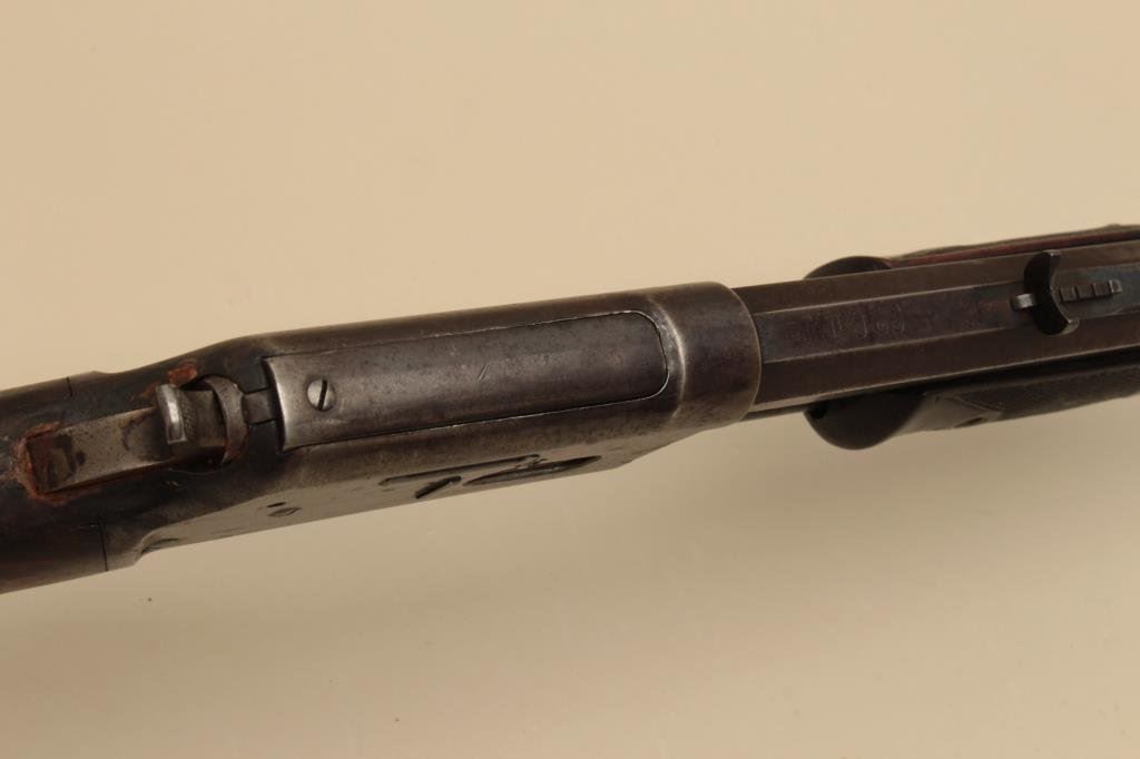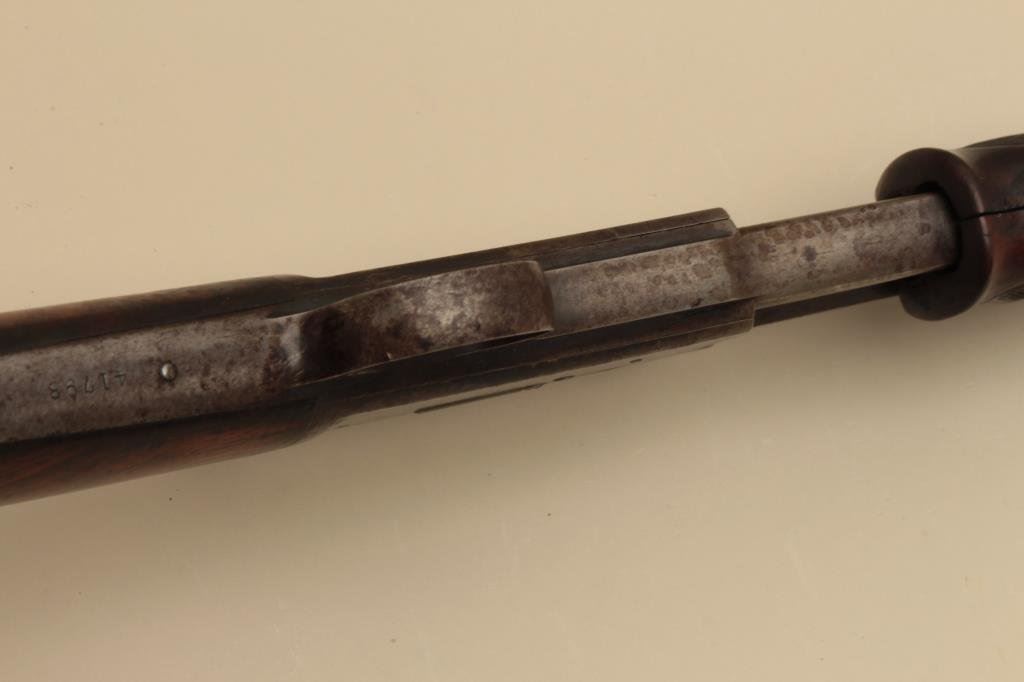 barrel, blued finish, wood butt stock with checkered wood forend, S/N 41798, in overall good condition showing traces of original blued finish mixed with a brown patina, good action and markings, good bore, sluggish action that is working but shows some surface rust along with some surface rust on the butt plate; overall good wood with normal wear and aging; a careful cleaning should benefit this nice Colt Lightning rifle. (Antique). Est.: $600-$1,200.
