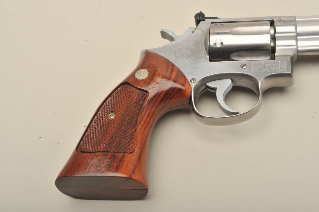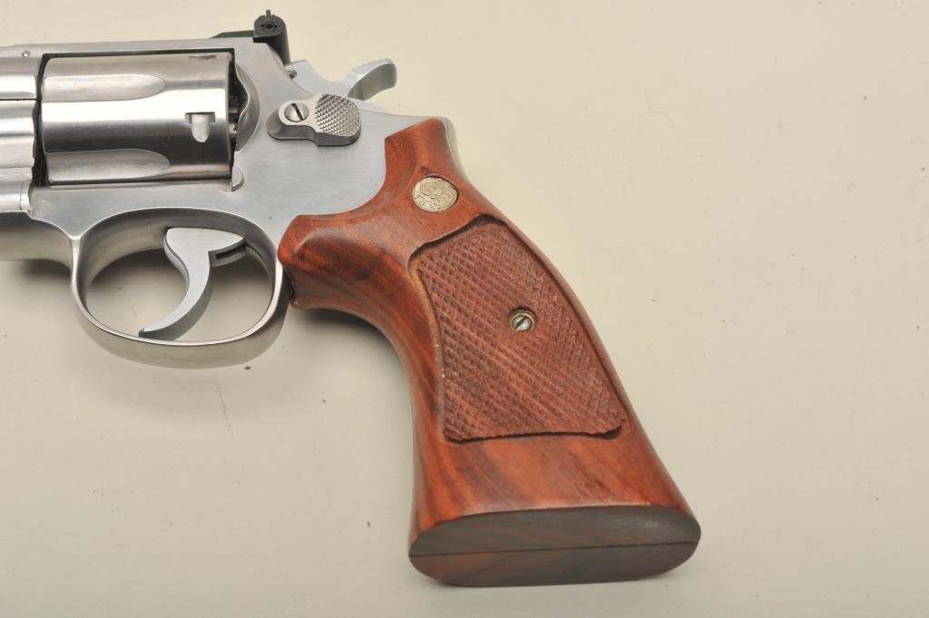 4” barrel, stainless, checkered wood medallion combat grips, S/N 50K4328, in overall near new condition with factory two-piece blue box and instructions (end label of box numbered to this gun). (Modern/PPT). Est.: $500-$1,000.