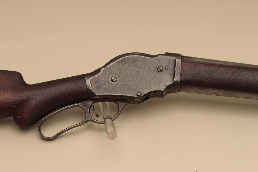 wood stocks, checkered steel butt plate, S/N 59580, in overall good to very good condition with a grey patina to metal surfaces, good action and markings, bore shows some scattered erosion, wood is overall very good; butt plate shows some surface rust that should clean. (C&R). Est.: $500-1,000.