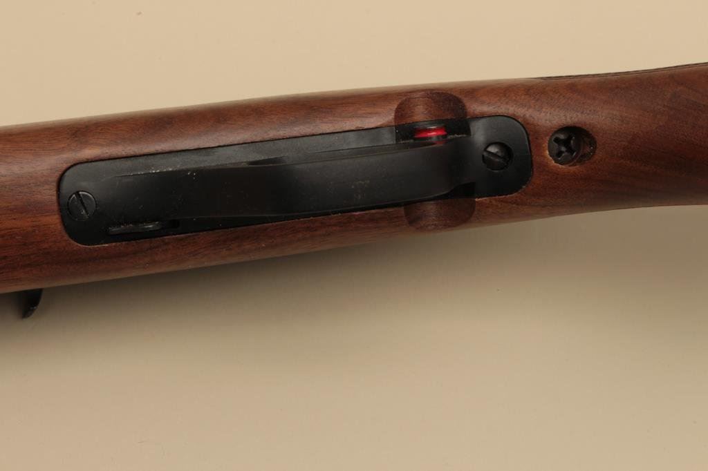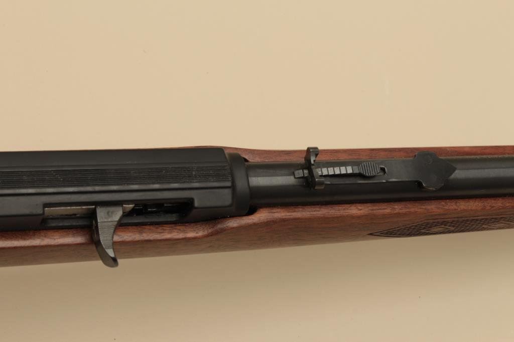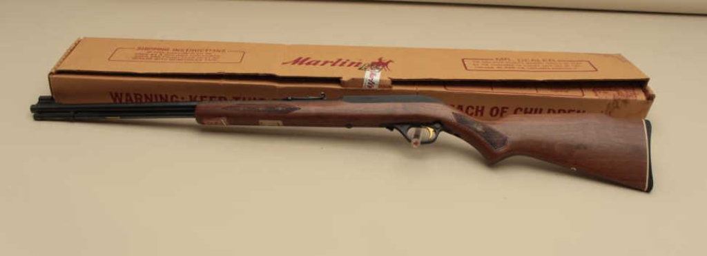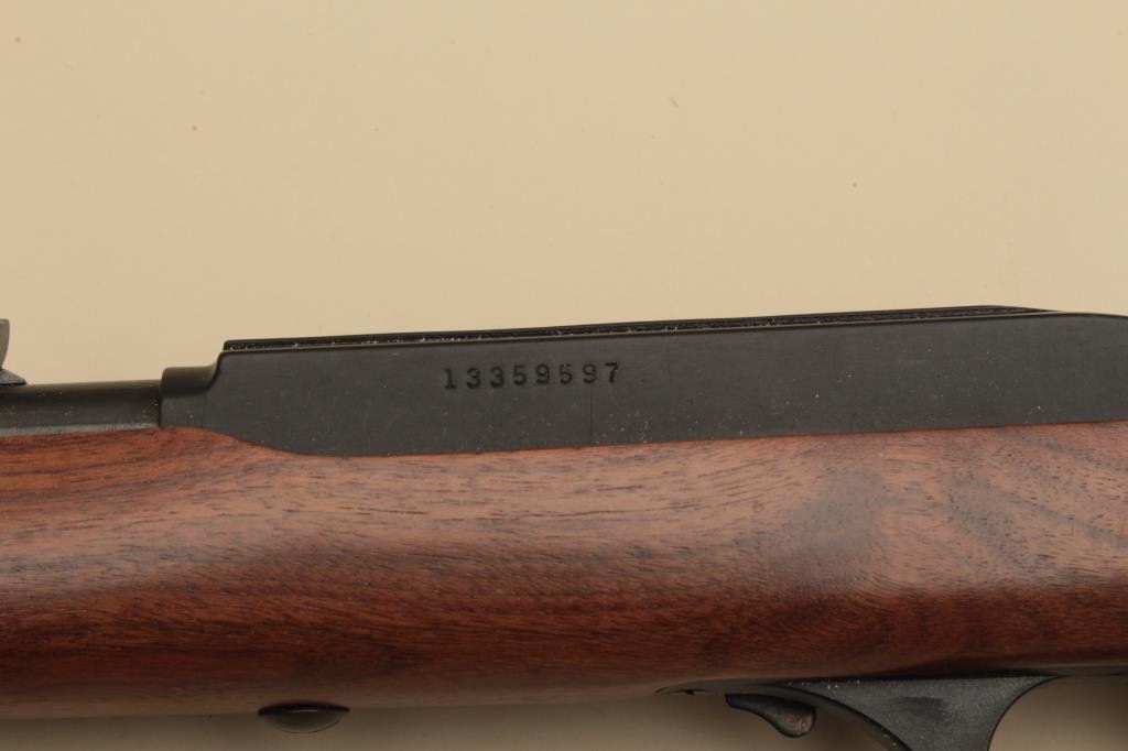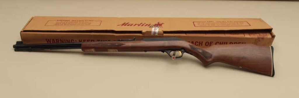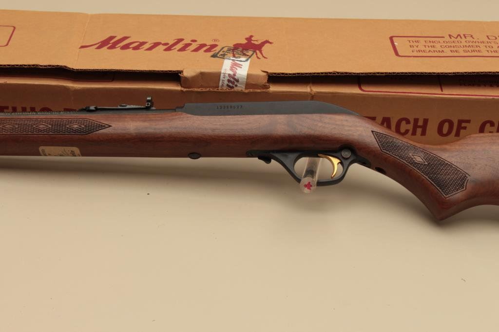 caliber, Serial #13359597. The rifle is as new in the box with a 22” barrel. The rifle retains nearly all of its blue finish with only handling marks noted. The checkered wood stock is in excellent condition with only storage marks and a brass Duck’s Unlimited medallion inlaid into the left side of the butt stock, which ends with a Marlin marked plastic butt plate. The rifle is as new in the factory box with all packaging materials. (Modern). Est.: $150-$300.