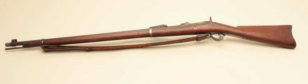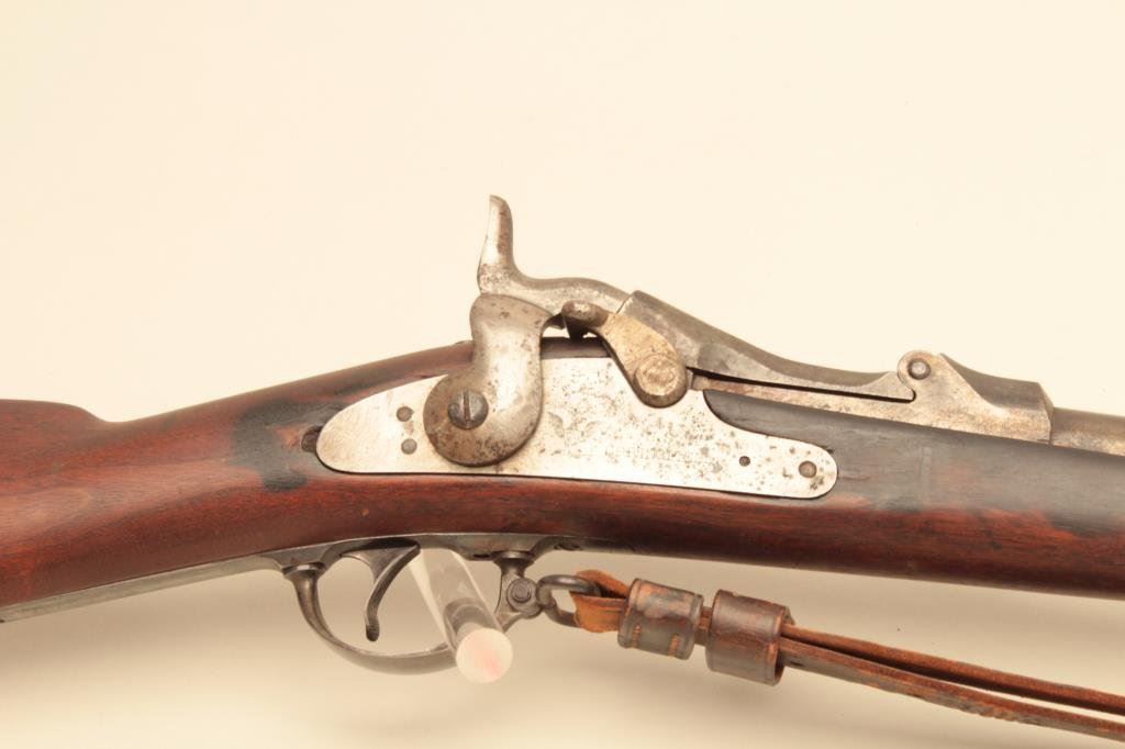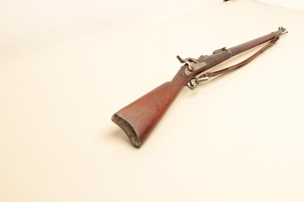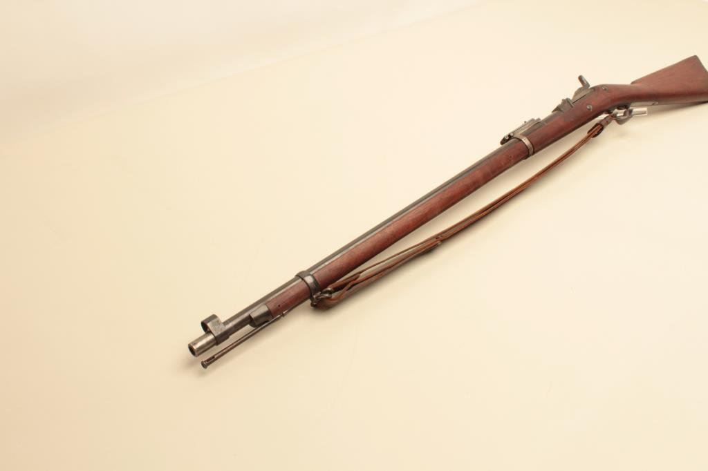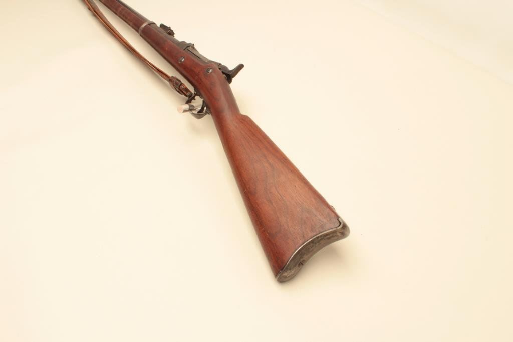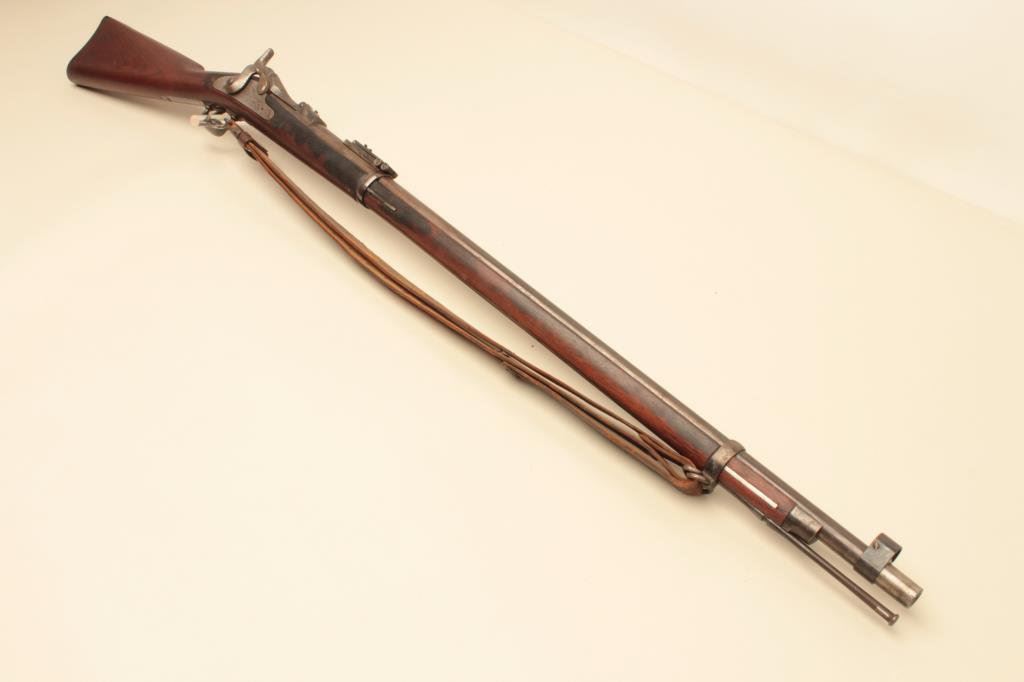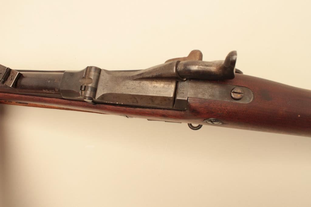 marked on top of “trapdoor”; wood stock, S/N 388868, overall fair to good condition with areas of blued finish on top of barrel, good bore, crisp action, wood stock shows some areas of dark discoloration, mostly on right side, old leather sling, visible circle P proof and partially visible inspector’s cartouche on left side of stock above trigger. (Antique). Est.: $400-$800.