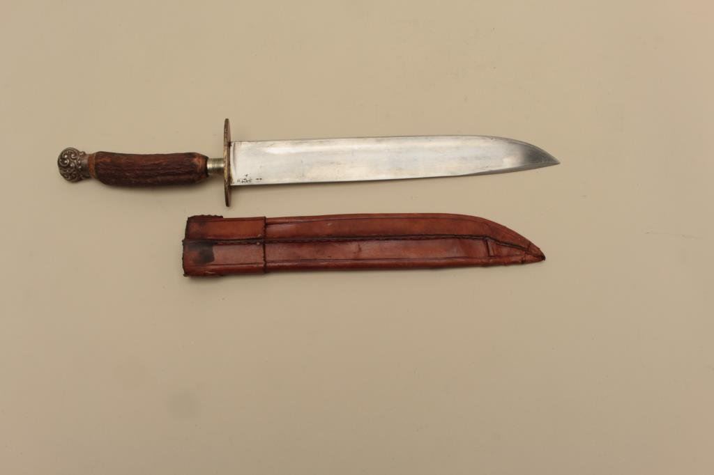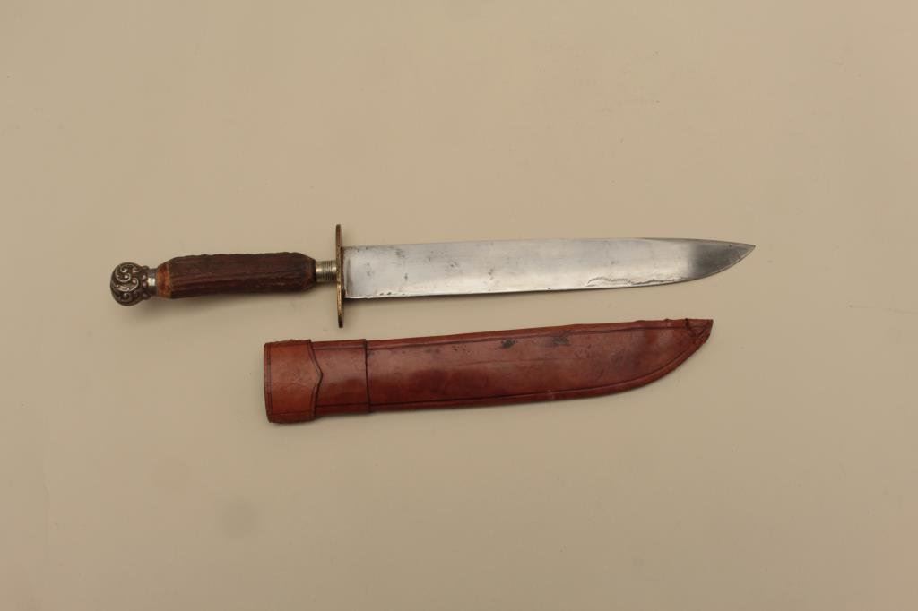 Lot 577 Nineteenth Century semi-clipped point Bowie knife with leather sheath; stag