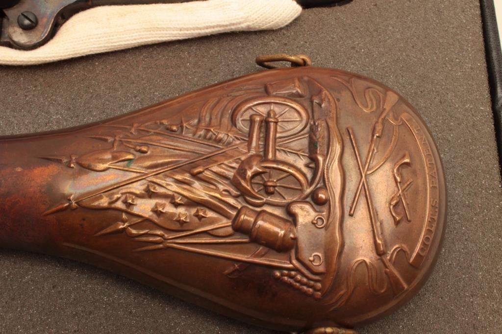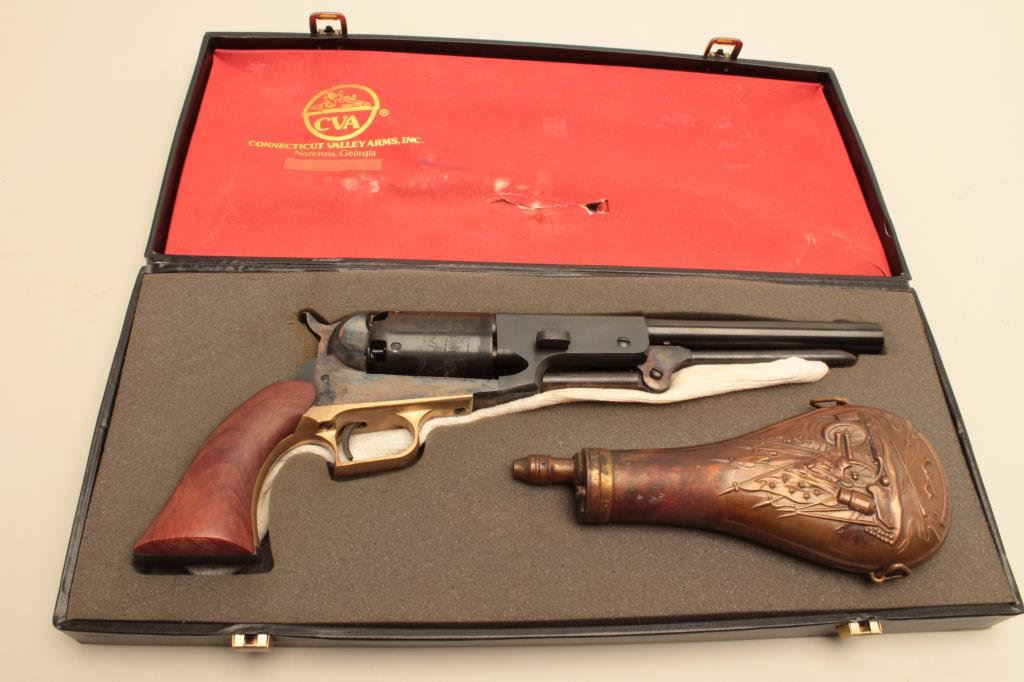 caliber, 9” barrel, blued and case hardened finish, wood grips, S/N A79700, in like new condition showing little handling; accompanied by a modern CVA-marked casing with brass powder flask. (Percussion). Est.: $300-$600.
