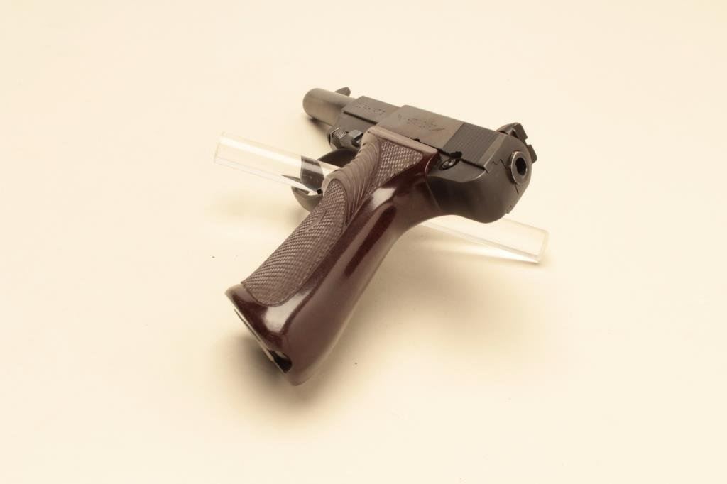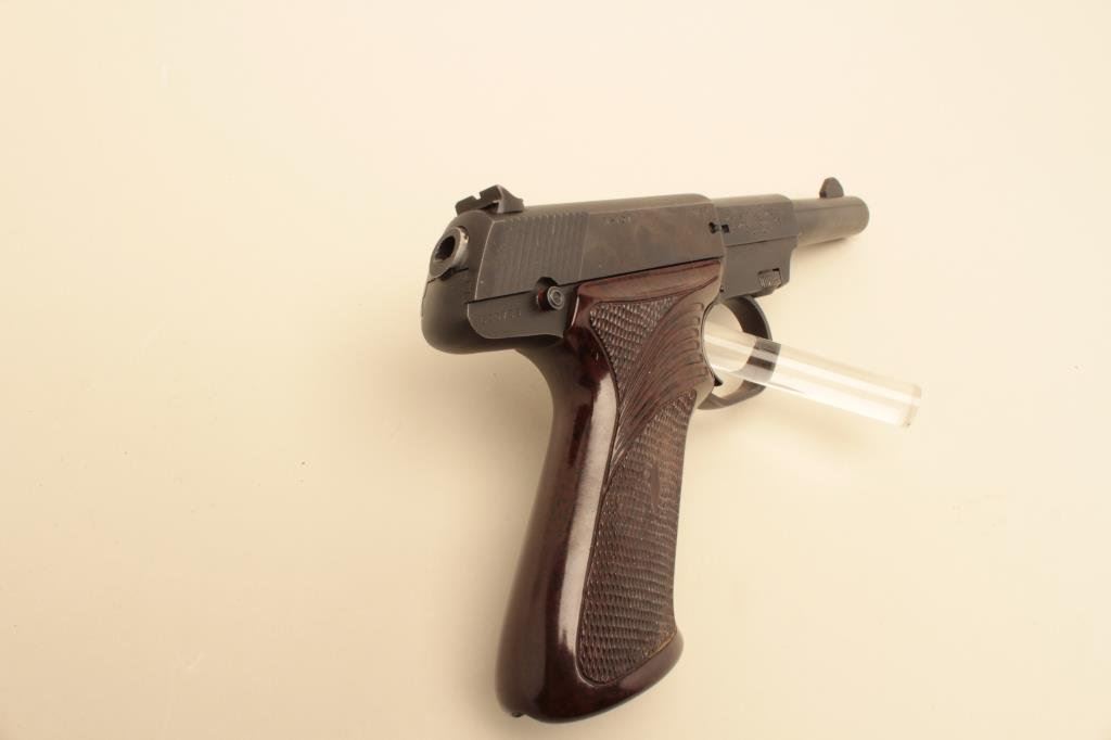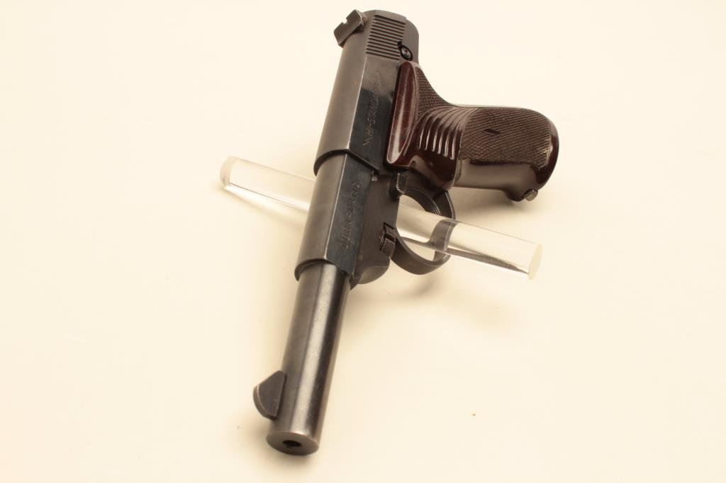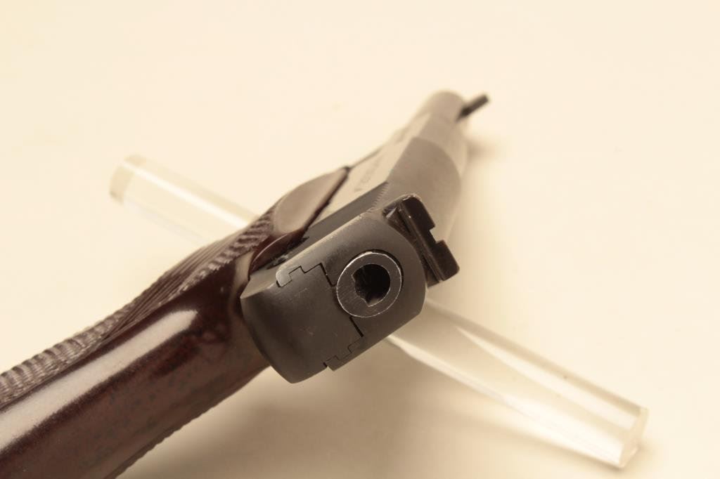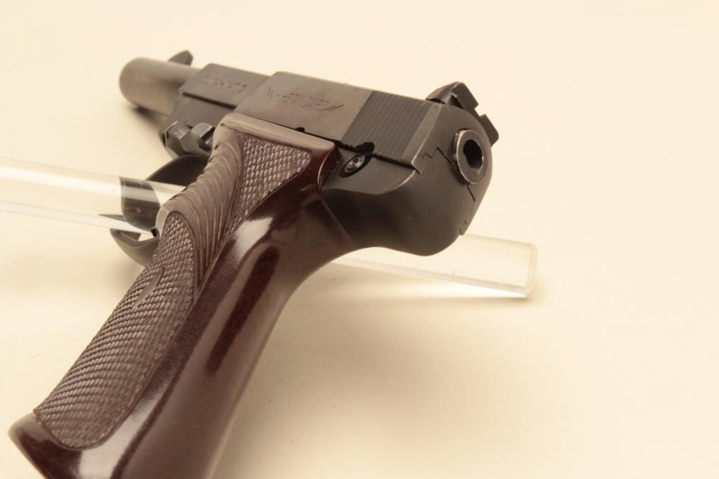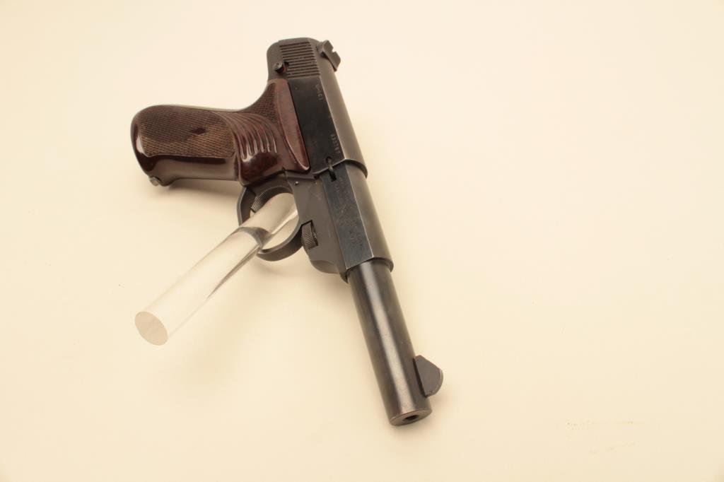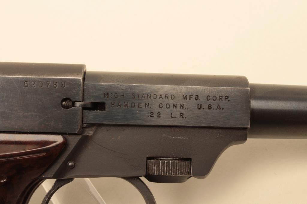 The pistol is in very good overall condition with a 4 ½” barrel. The pistol retains the majority of its blued finish with small scratches and some loss of finish at the muzzle. The checkered plastic grips are in good condition showing light wear from carry and use. The bore is good, the action crisp and markings are sharp. The lot includes one High Standard marked magazine. Est.: $150-$300. (Modern).