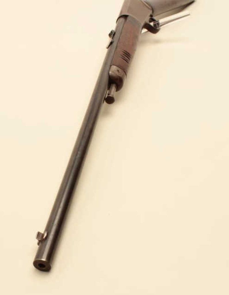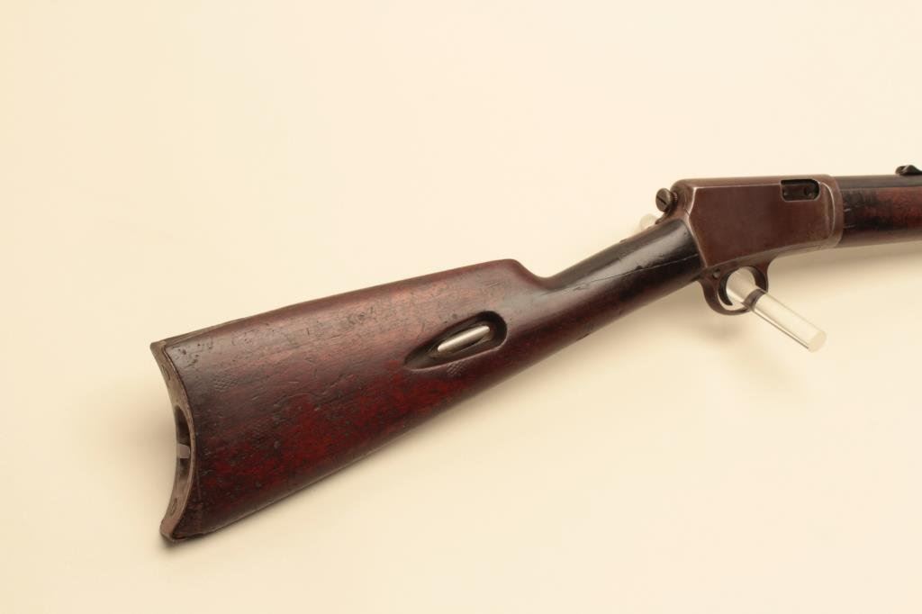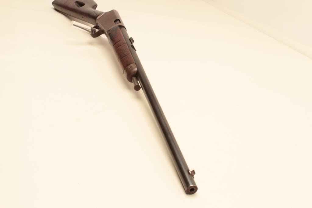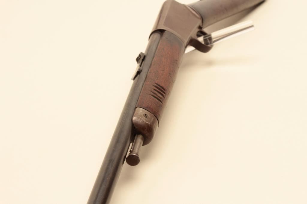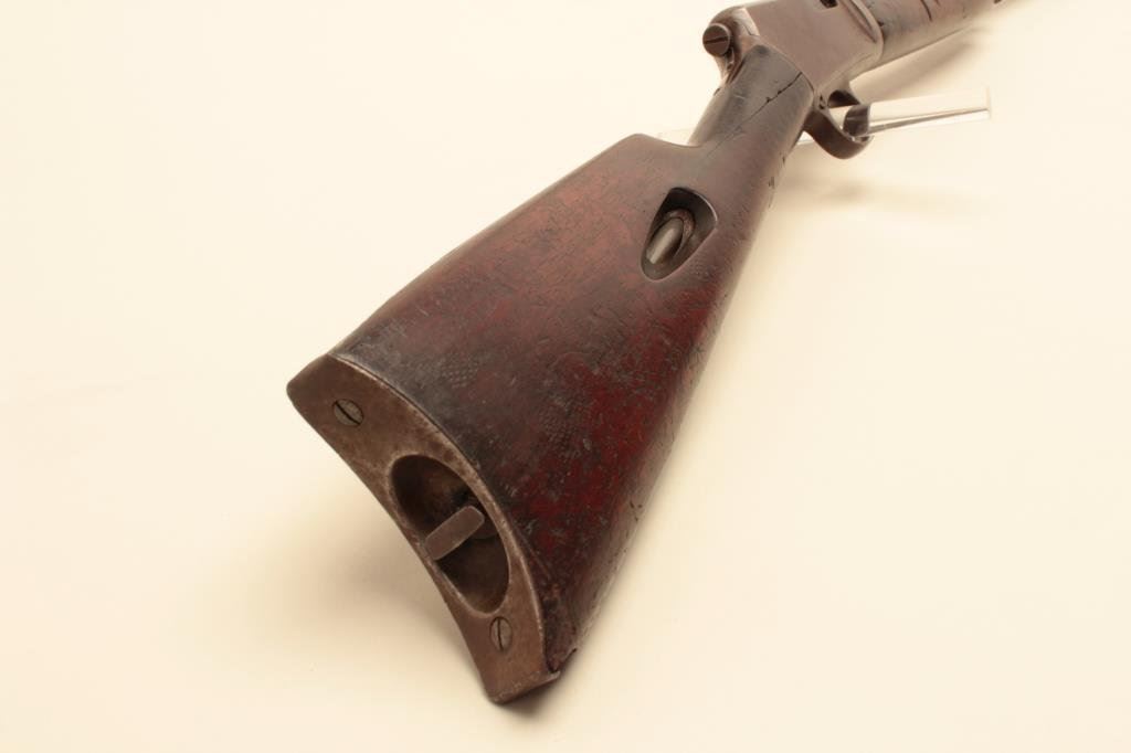 blued finish, wood stocks, S/N 87313, in overall fair + condition showing muted blued finish to the barrel and brown patina to receiver, good bore, good action, wood forend shows 8 old hash “kill” marks; butt stock shows a crack at the wrist and the butt plate has been bent over the bottom of the butt where there was an old small loss of wood; “P” carved into the left side of the butt stock. (C&R). Est.: $200-$400.