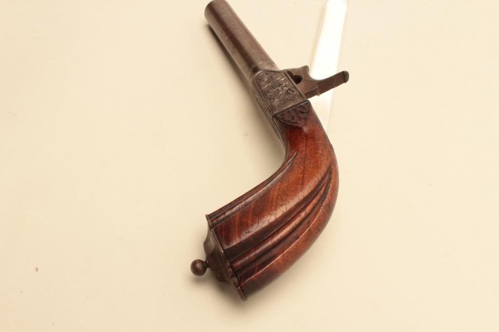 Lot 644 European single shot percussion pistol, folding trigger, engraved frame, wood
