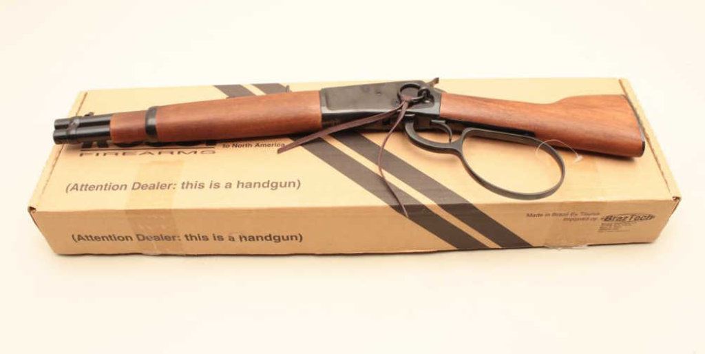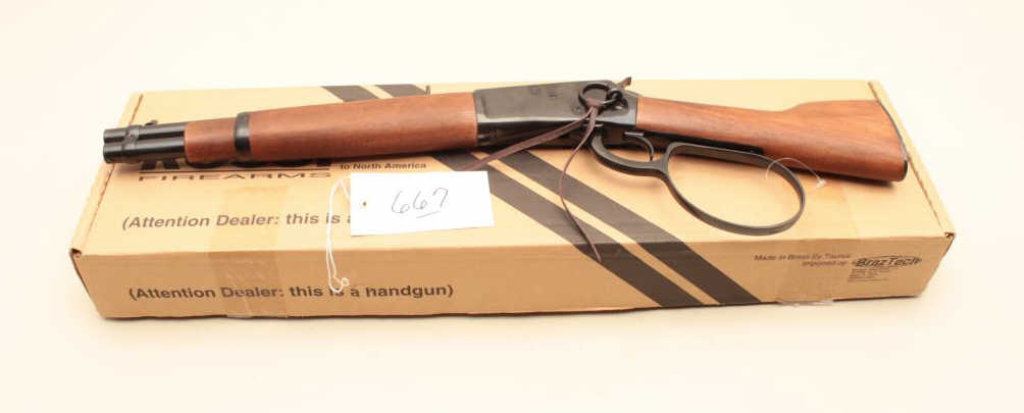 box and patterned after Steve McQueens “Wanted Dead or Alive” lever action. The barrel measures 11 ½” and measures 24” overall. Defined by the ATF as a pistol. (Modern/PPT) Est.: $200-$400