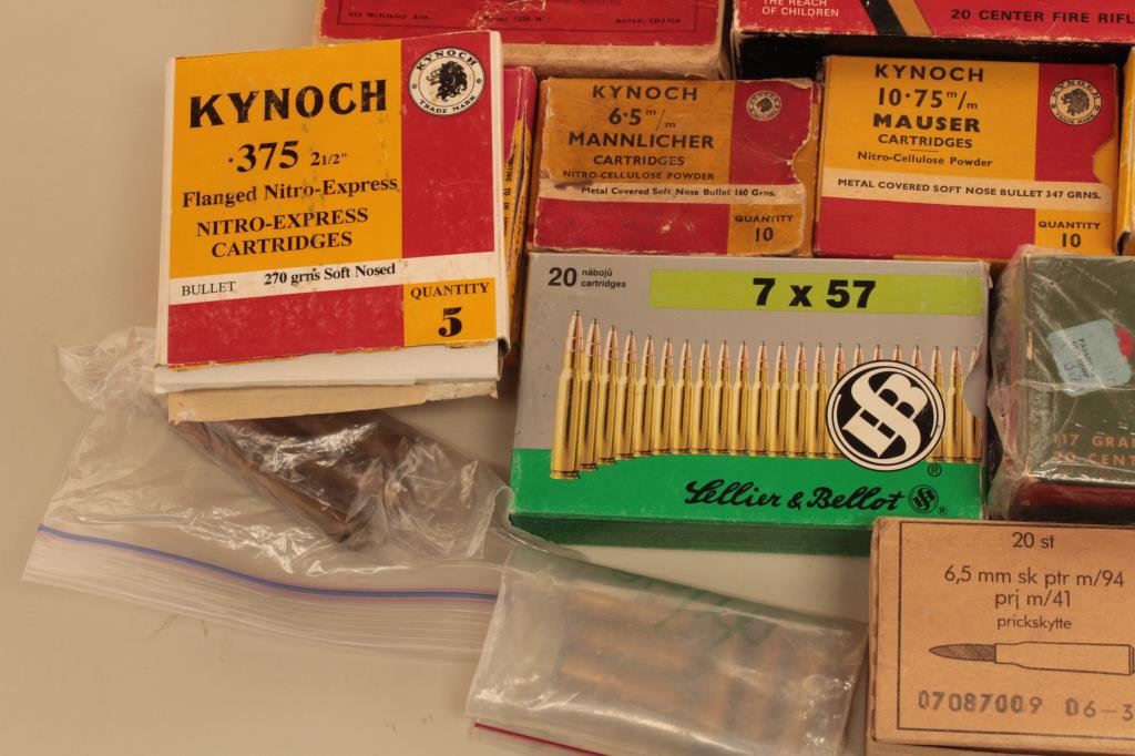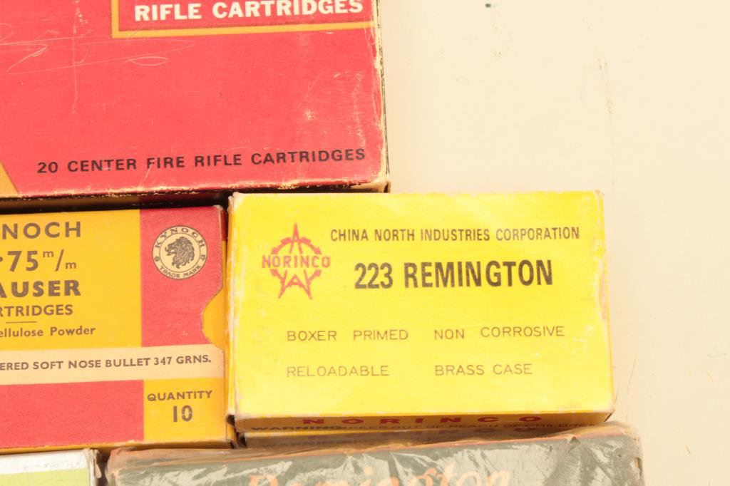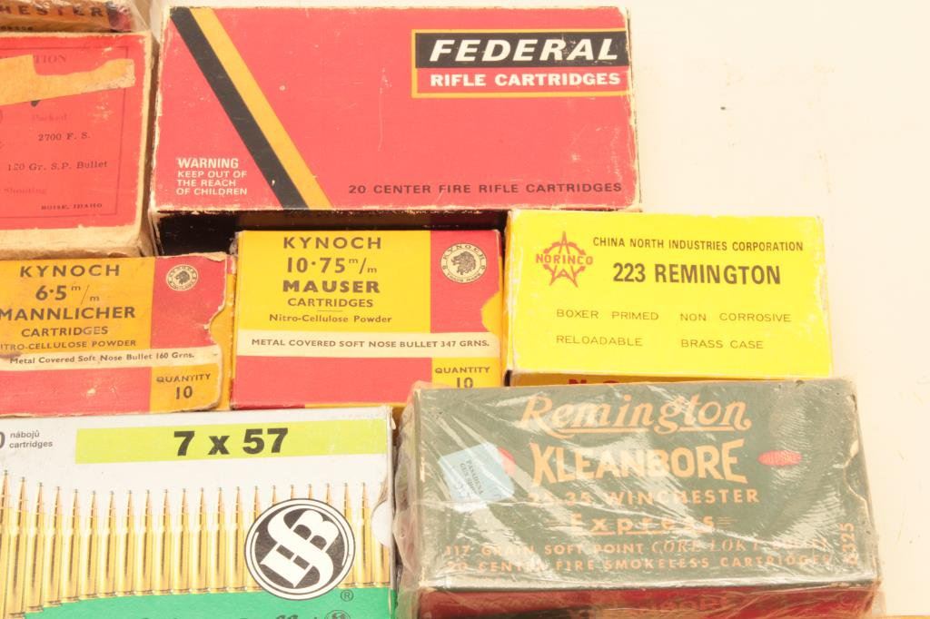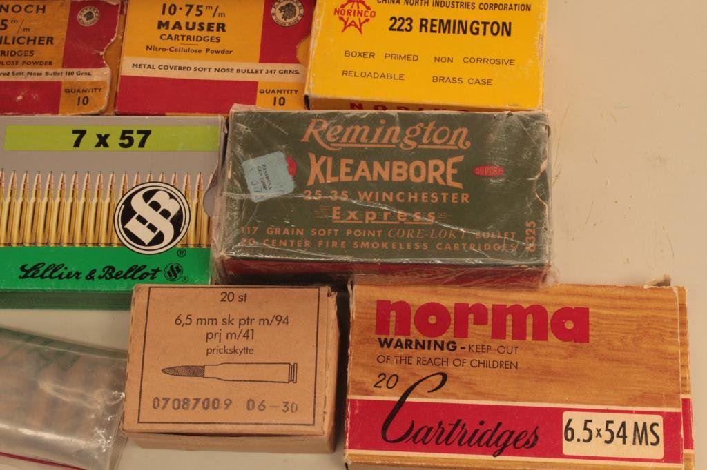 of Winchester .38-40 and two boxes of Remington .25-35 Winchester. Additionally, the lot includes a vintage box of .256 Newton, Kynoch and Norma 6.5 x 54 Mannlicher, 6.5 x 55 Swede, 7 x 57 Mauser and two old boxes of Norinco .223. A great collection of vintage ammo in a host of calibers. Est.: $150-$300.