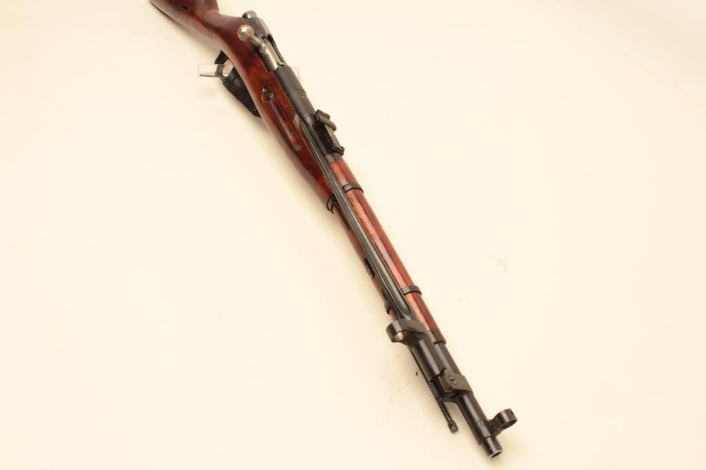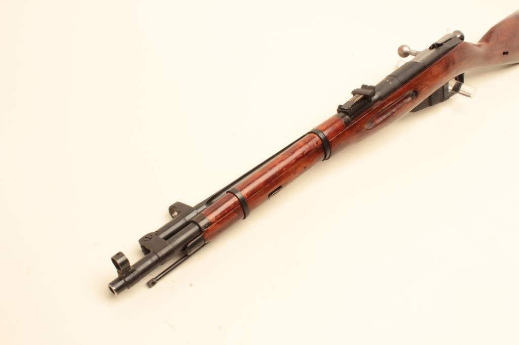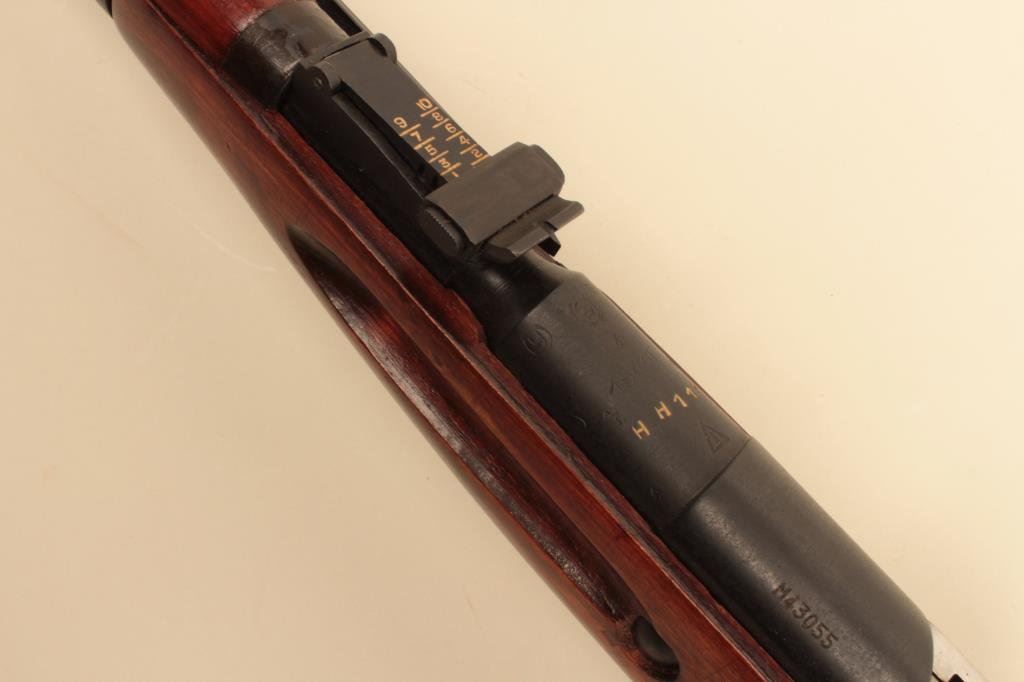 The carbine is in very good overall condition with a 21” barrel with an aircraft style hooded front and military tangent rear sights. The carbine also features a folding spike style bayonet. The barrel and receiver retain the majority of their military style finish with small mars and compressions consistent with service use. All visible serial numbers are matching. The receiver has numerous proofs and is dated 1944 on the front ring. The smooth wood stock is in good condition with numerous cartouches on the right side, top and behind the trigger guard. The butt stock ends with a smooth steel butt plate. The bore is fair, the action crisp and markings are sharp on this World War II era Nagant. Est.: $125-$250. (C+R).