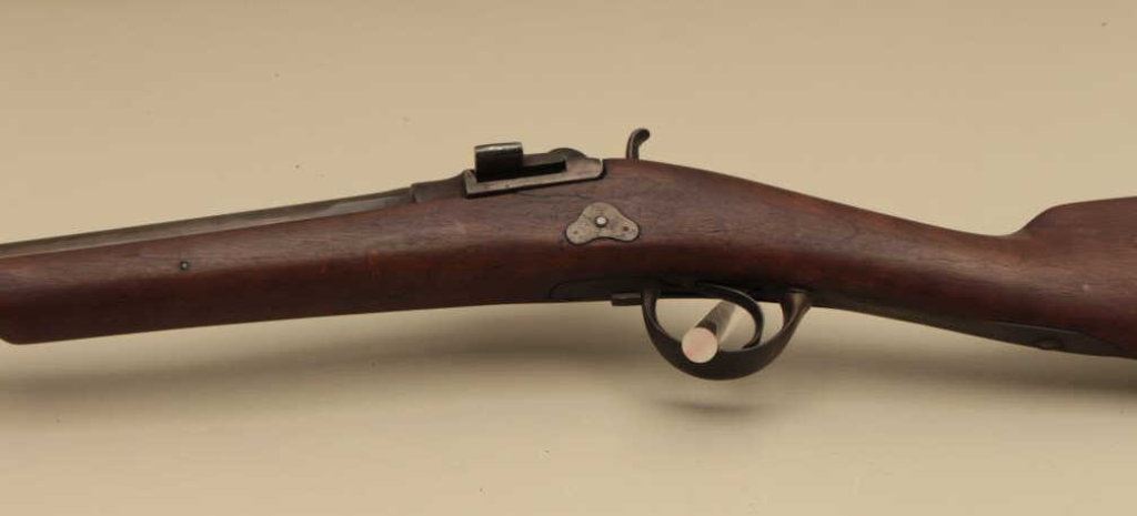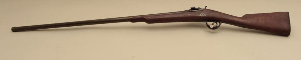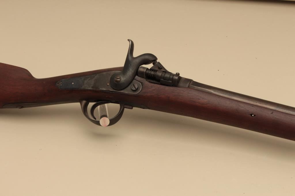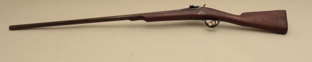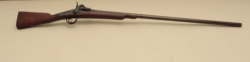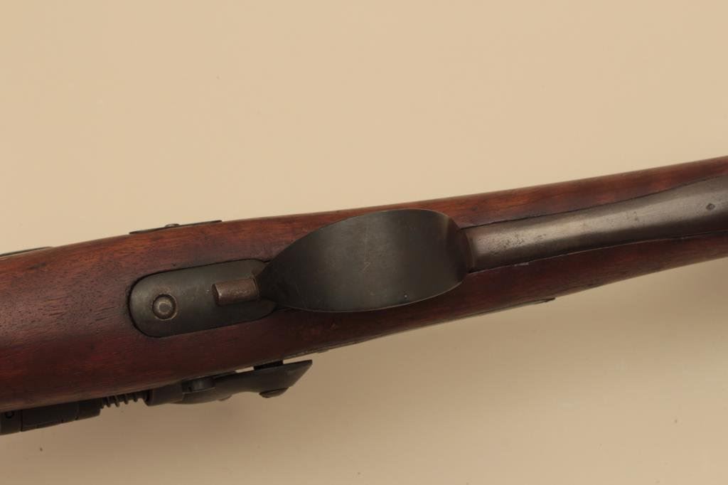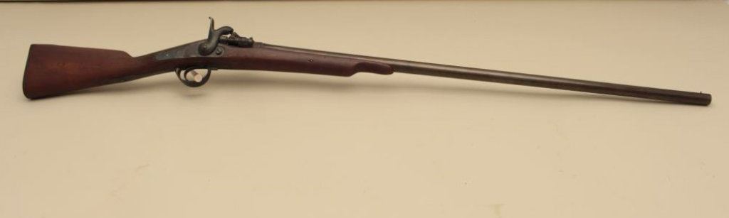 overall condition with 34” smoothbore barrel. The barrel and receiver have gone to a dark patina with light surface erosion and proof marks near the front ring. The smooth wood stock is in good condition with small mars and handling marks. The butt stock ends with a smooth steel butt plate. (Antique). Est.: $100-$200.