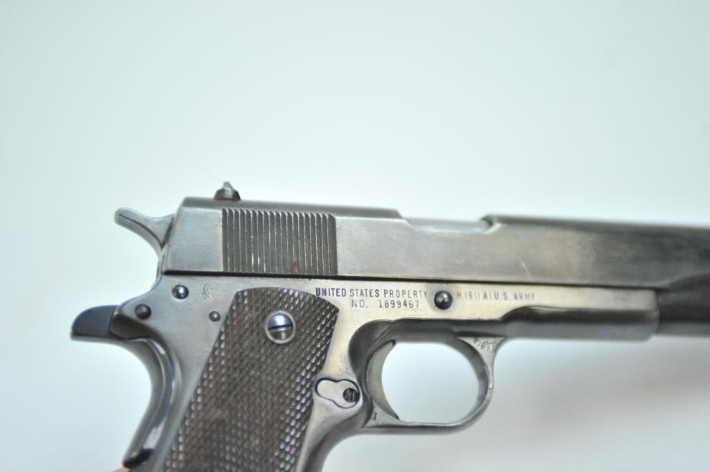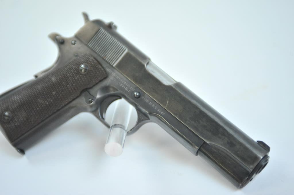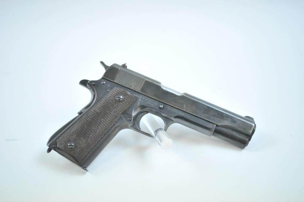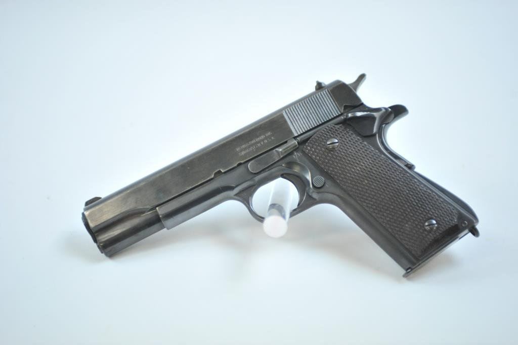 .45 caliber, 5” barrel, blued finish, checkered maroon plastic grips, S/N 1899467, in overall good to very good condition as re-done, very good bore, crisp action, very good markings and grips. (C&R/PPT). Est.: $500-$1,000.