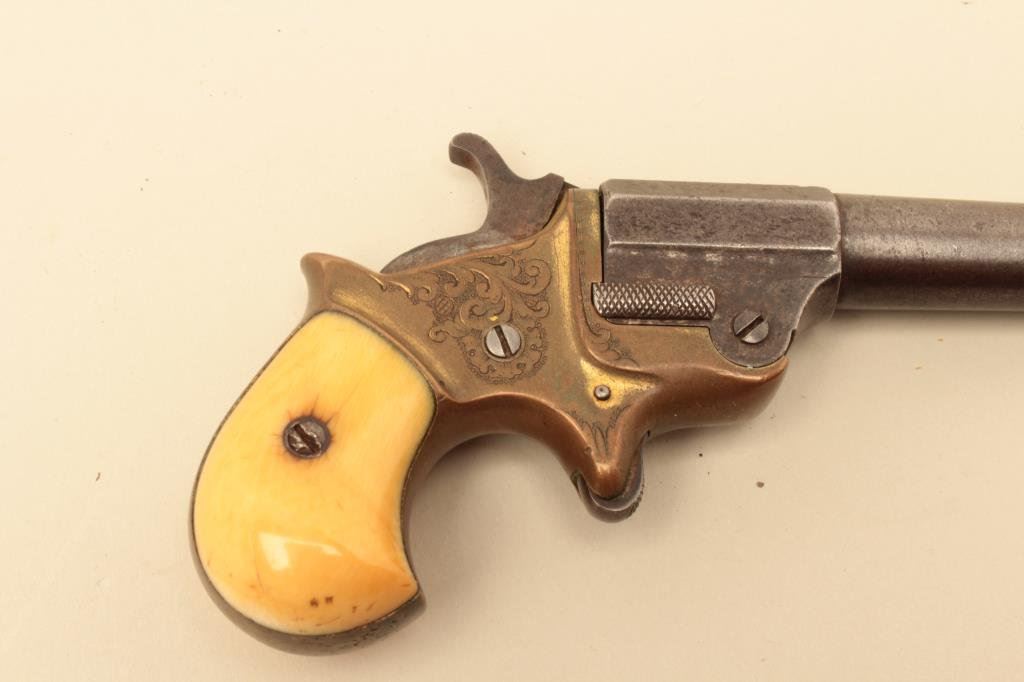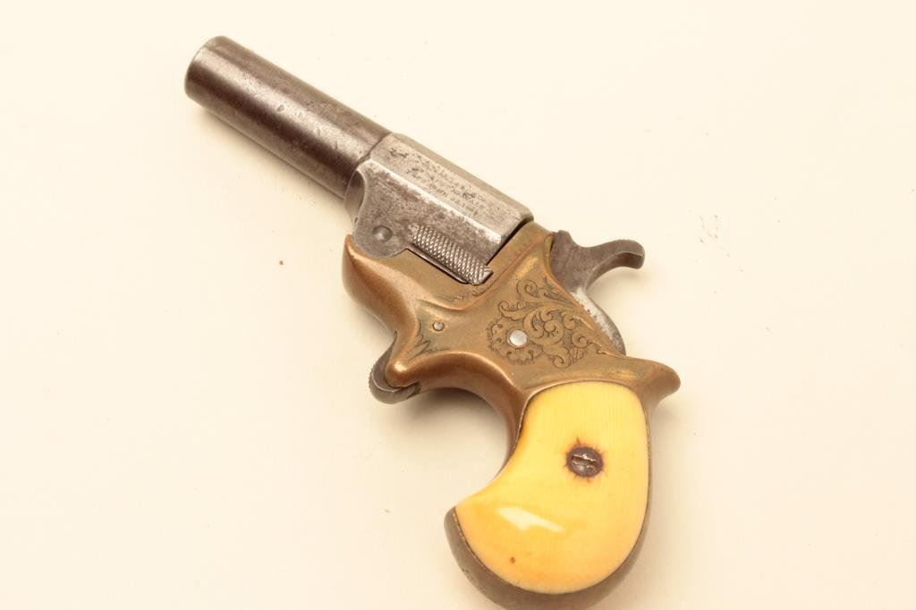 the period scroll engraving and authentic original ivory grips, S/N 1073. Traces of original blue and gold finish with legible markings. Good overall condition. In 50 years of selling antique arms I have seen less than 10 original engraved Ballard derringers. Rare. From an old time Palm Springs area collection. (Antique) est.: $700-$1400