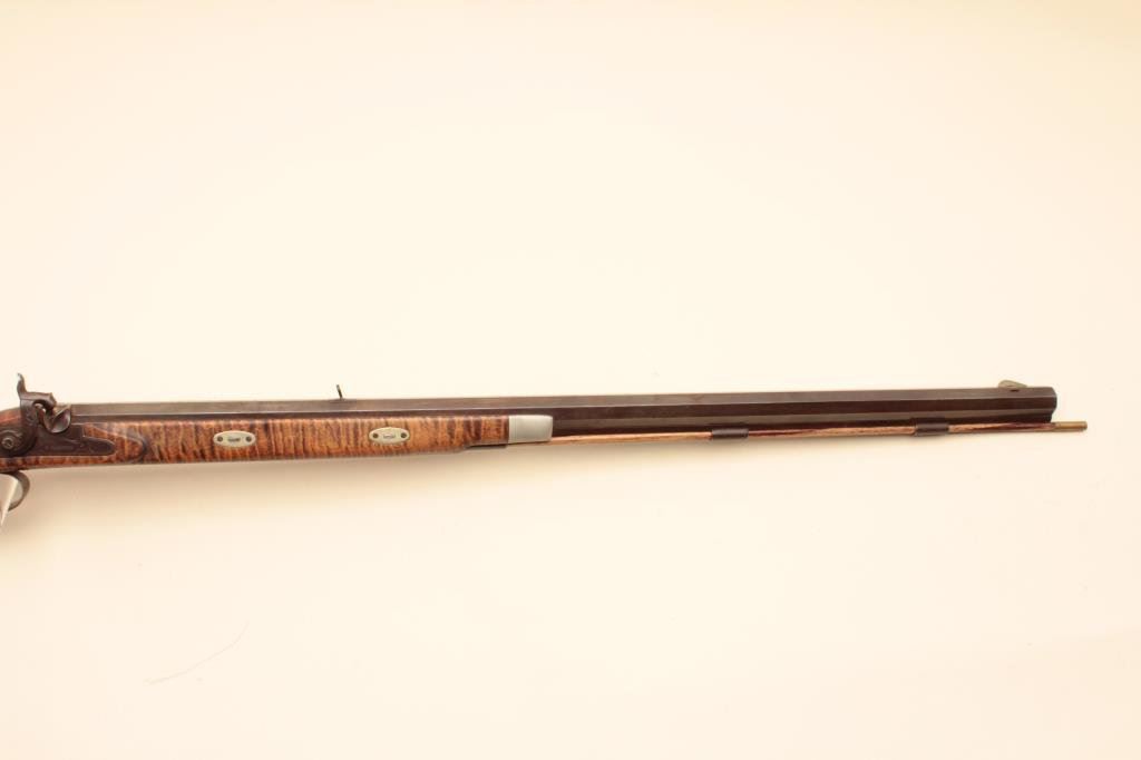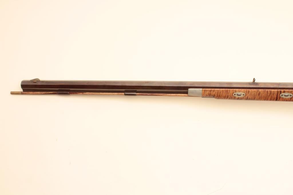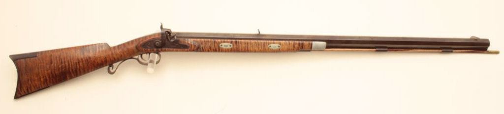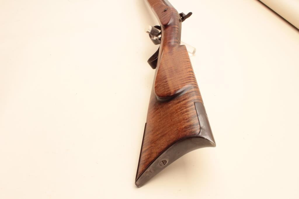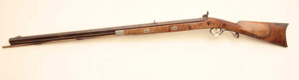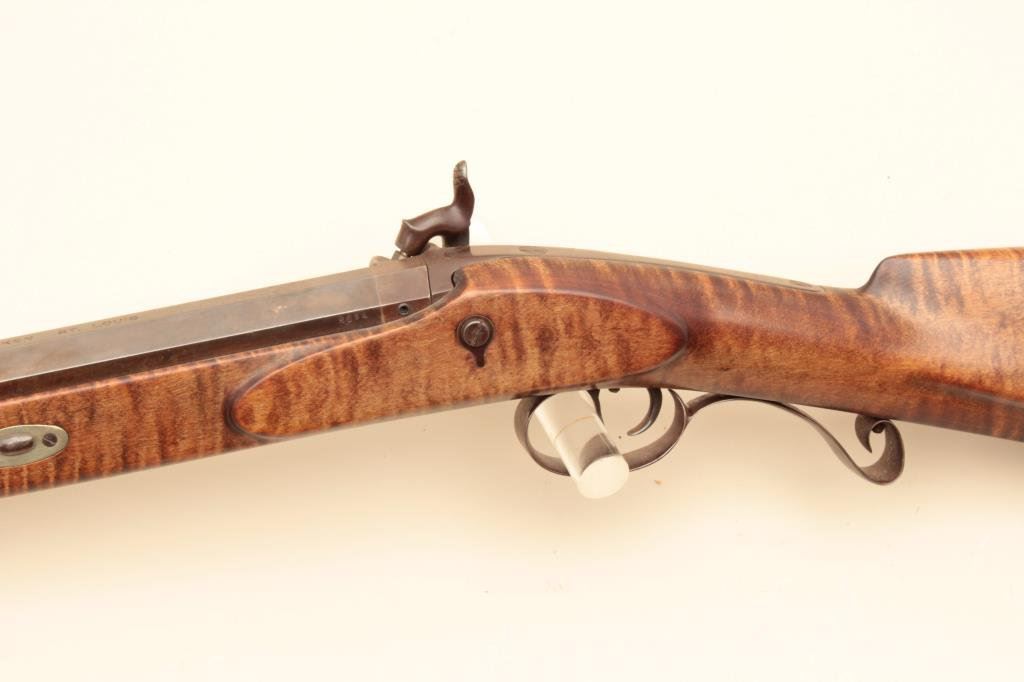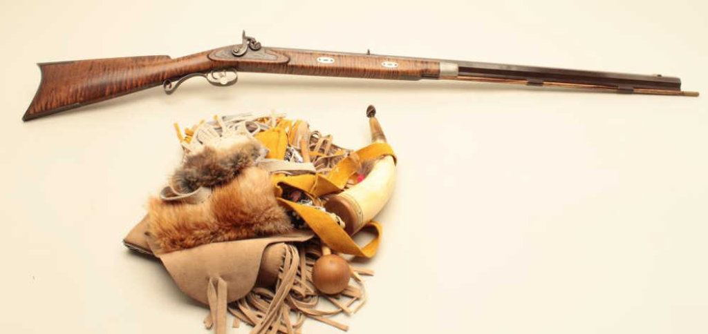 52" overall 1/2 stocked, double keyed, fine striped stock, .56 cal. approx. along with fringed and beaded boot, horn with pony bead strap hunting bag possible bag and rendezvous accessories. This is a quality outfit that would cost $2000-3000 to replace in our opinion. Les Gilman Collection. Est:$1000-2000