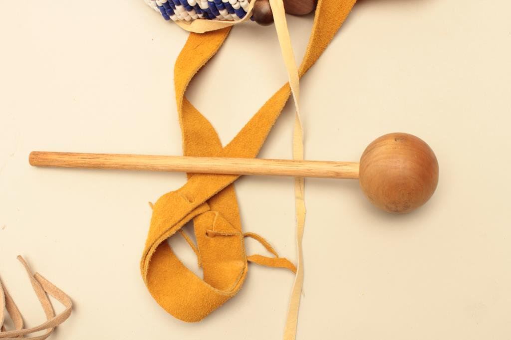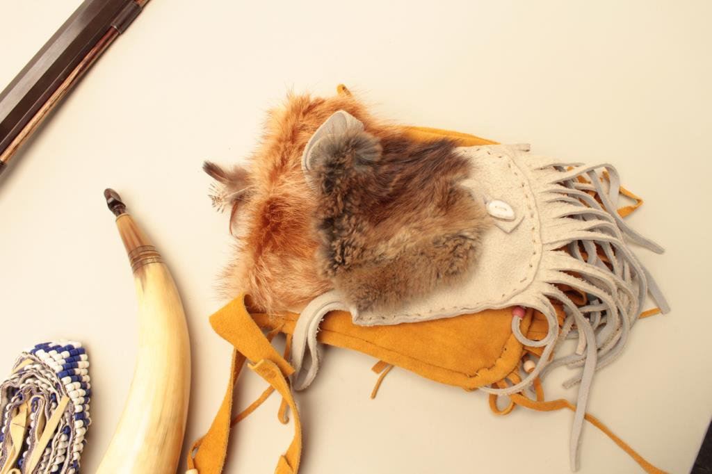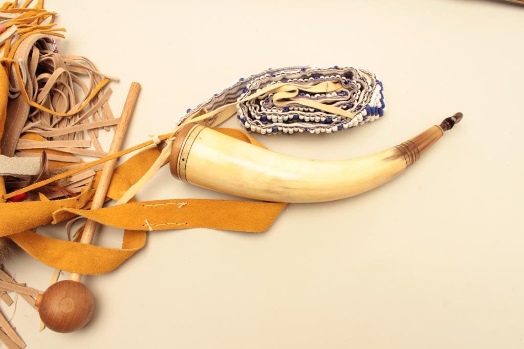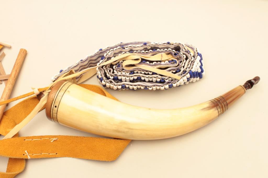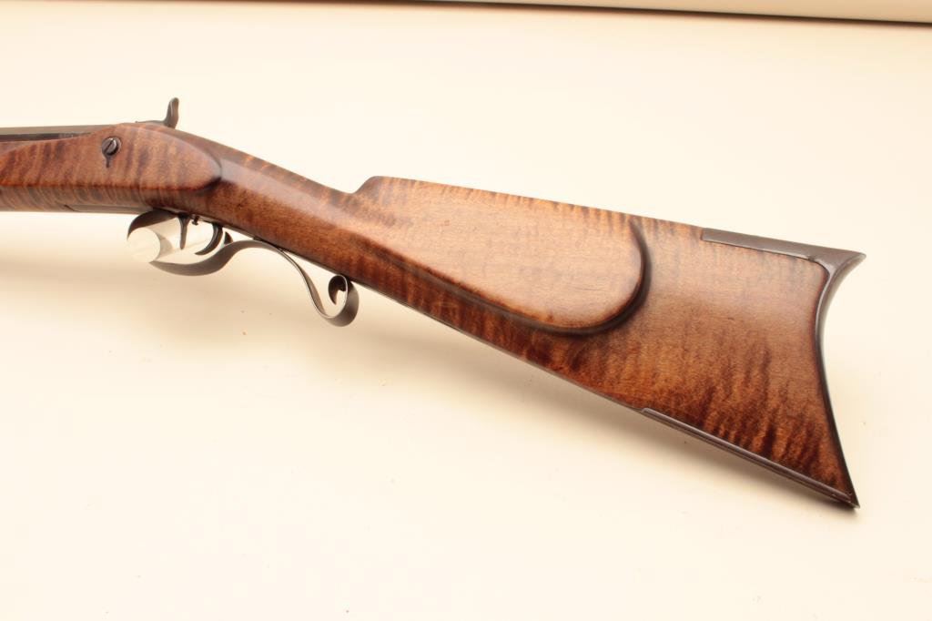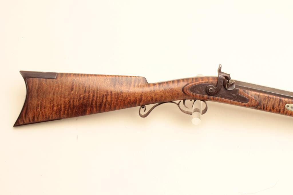 52" overall 1/2 stocked, double keyed, fine striped stock, .56 cal. approx. along with fringed and beaded boot, horn with pony bead strap hunting bag possible bag and rendezvous accessories. This is a quality outfit that would cost $2000-3000 to replace in our opinion. Les Gilman Collection. Est:$1000-2000