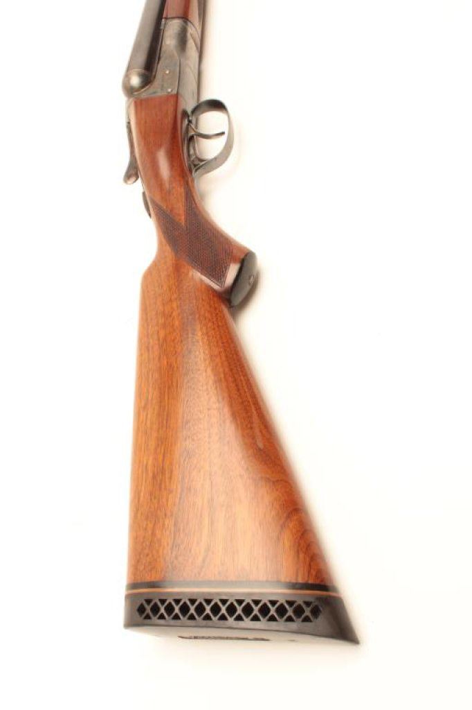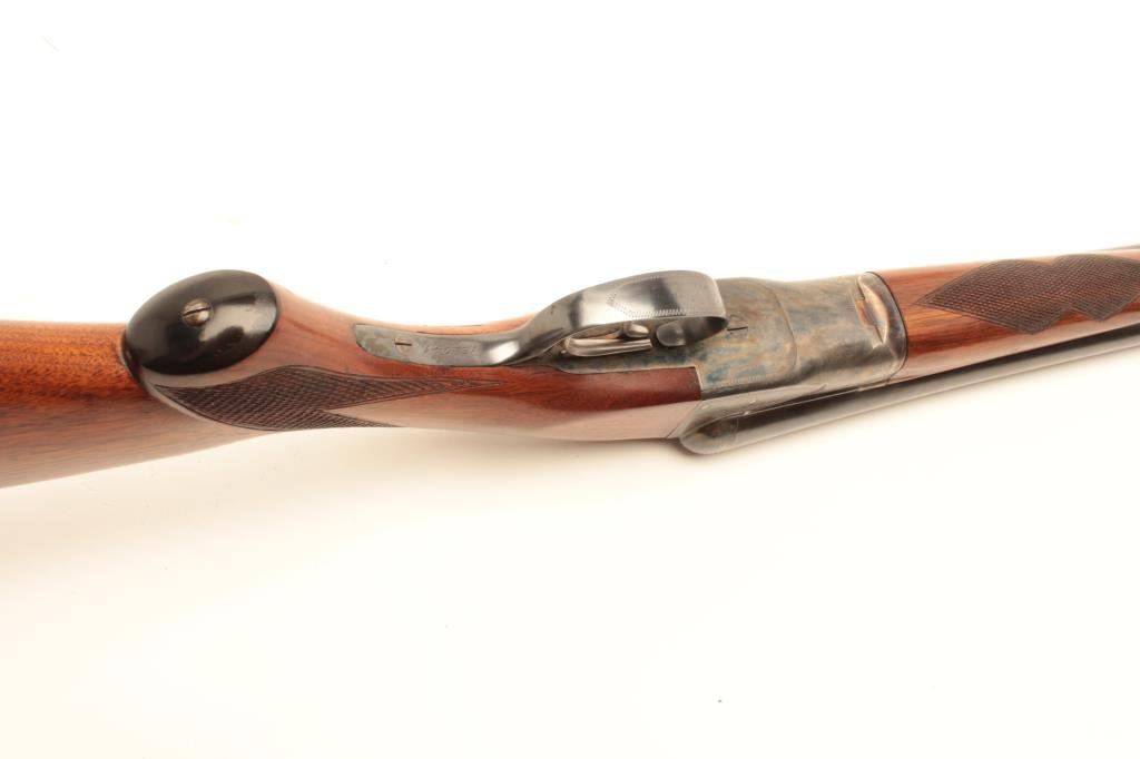 in fine original condition, S/N 122041. Choked full and modified. 90%-95% original blue and case colors. Very good wood stock with crisp checkering. Excellent bores and locks up tight. Measures 14 ¼” to the end of added rubber pad and 13 ½” to the end of the wood. Standard double triggers and extractors. Very crisp. (C&R) Est.: $850-1700