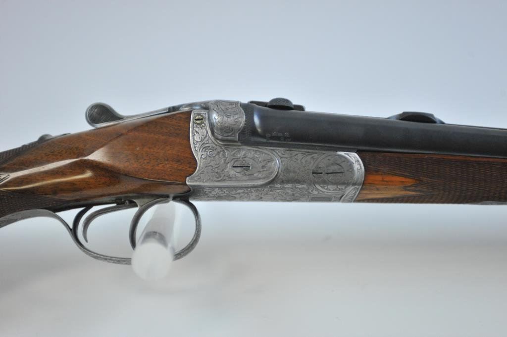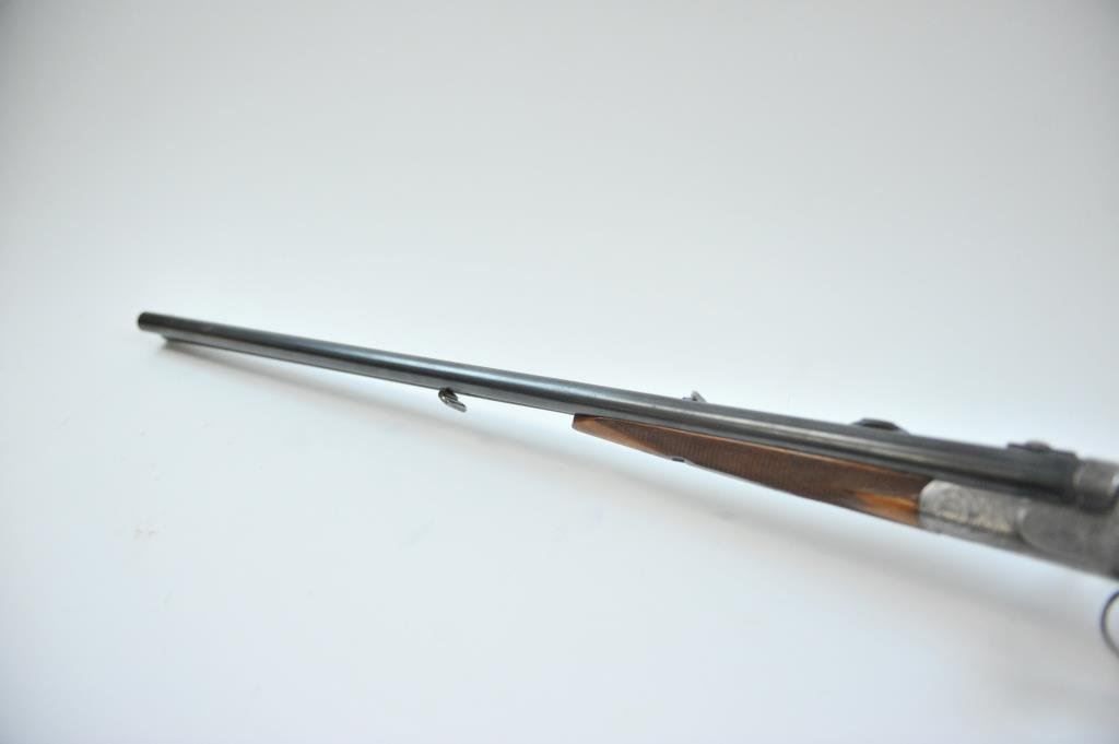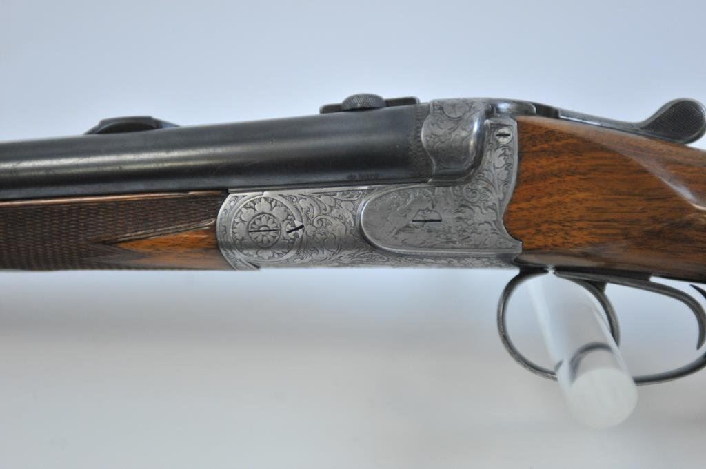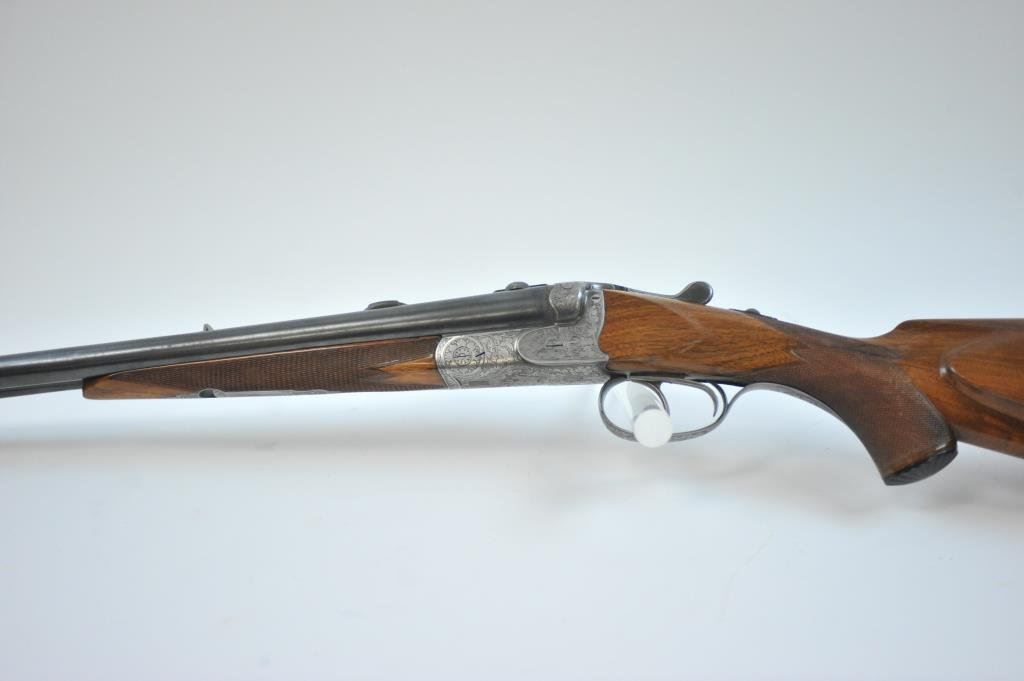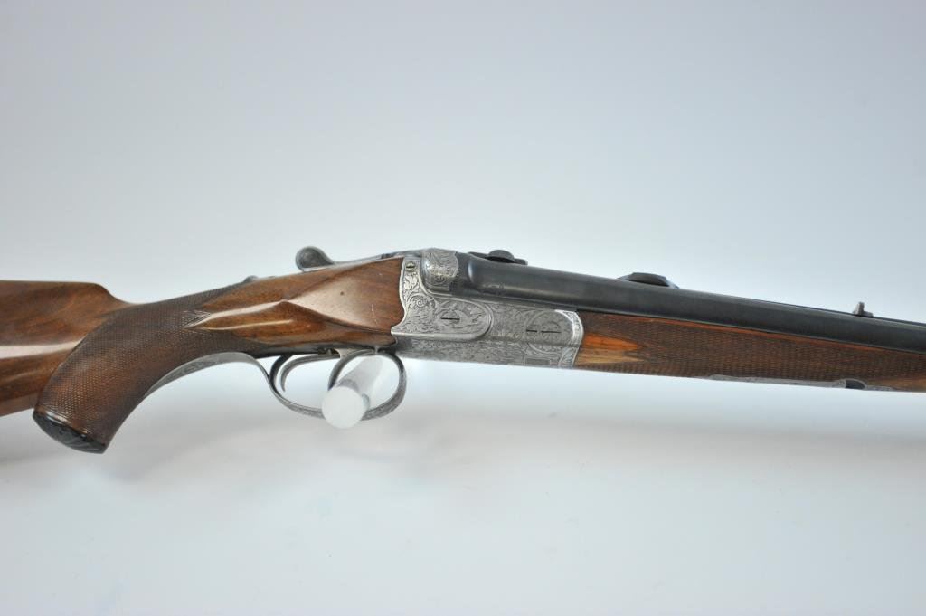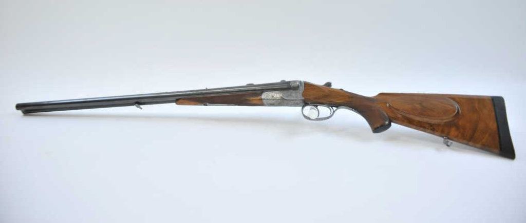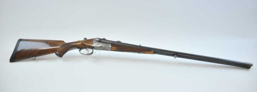 SxS barrels in 20GA and 25-35 Win caliber. The water table shows German pre-war proofs for 20GA and 6.2x52mm, S/N 210 with no maker or dealers name possibly a “Guild gun”. Shows a European quality older refurbish with 95% well replaced blue finish, polished to satin engraved frame, refreshed and checkered wood with thick recoil pad added. Locks up tight with very good bores. Est.: $1400-$2800