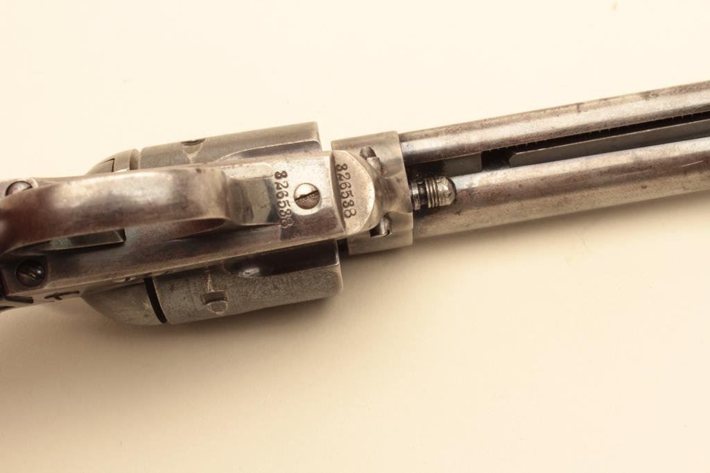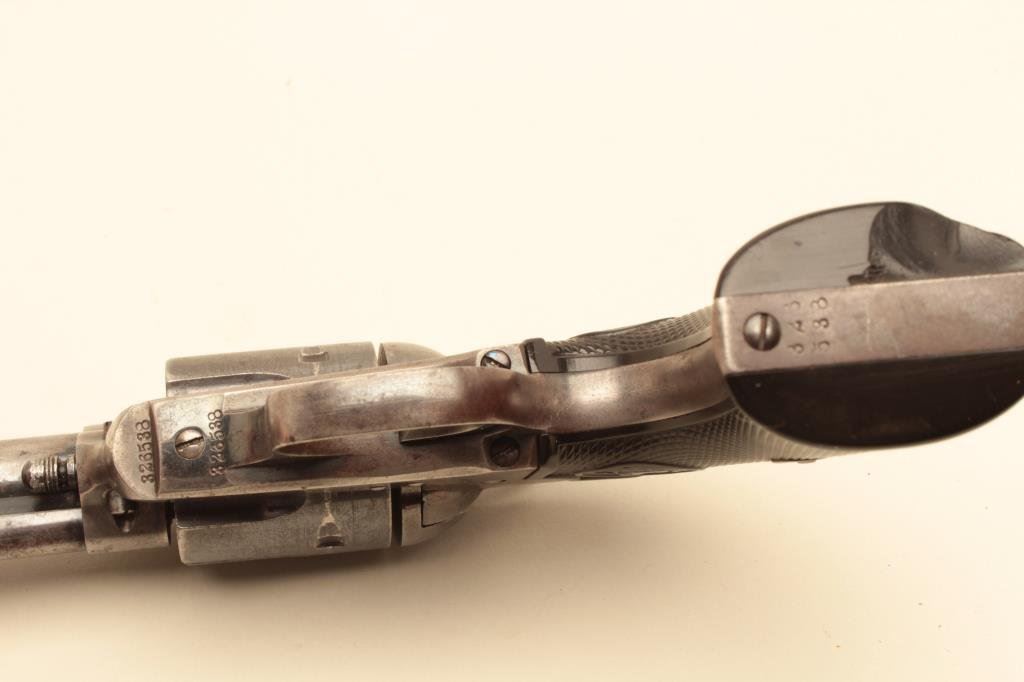 with a 7 ½” barrel, blue and case hardened finish, hard rubber grips, S/N 326538. Good plus to very good overall with 30%-50% original blue and case hardening. Some normal aging and minor erosion along with just starting pinprick pitting in a few areas that is minor. The front sight is almost its full original height and slimmed minutely. Good markings and good grips that would have been very good plus except chip from the bottom left. All matching. Tight mechanically with bright bore. Made about 1913 and from a Salt Lake collection. (C&R/No PPT) Est.: $1500-$3000