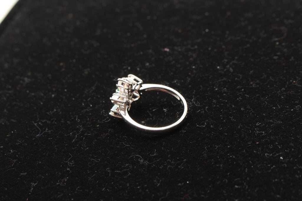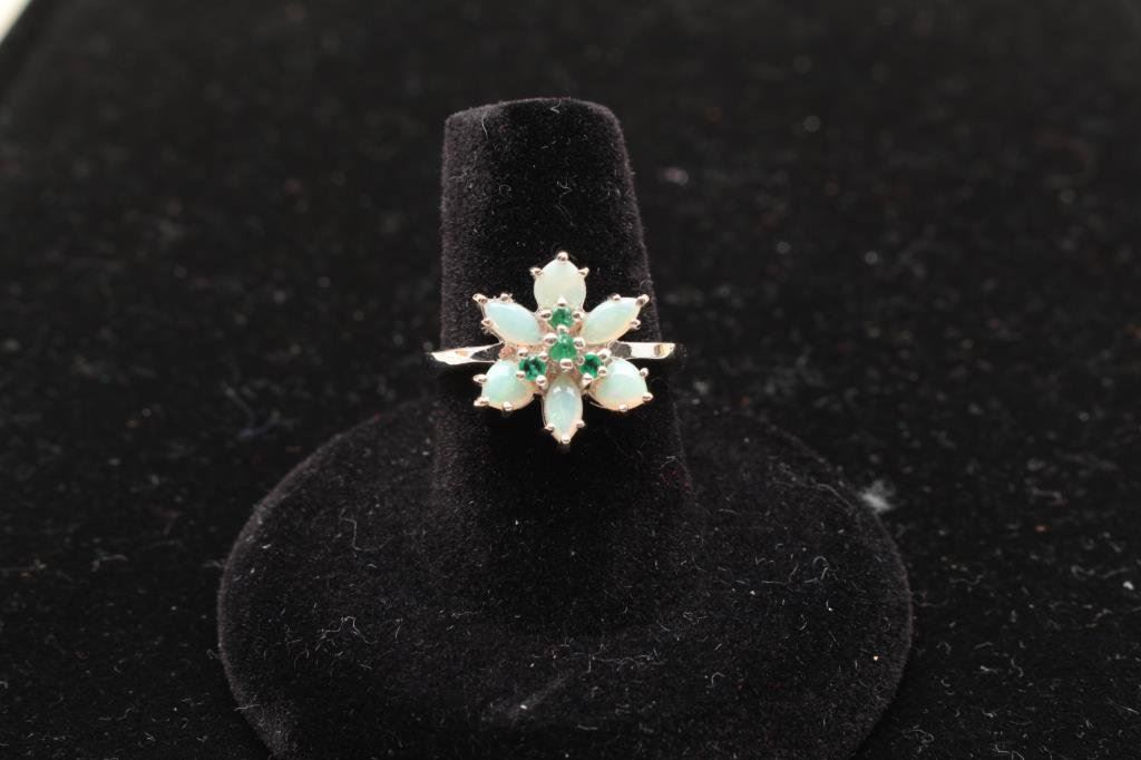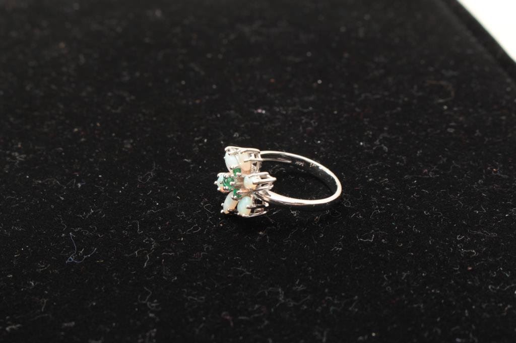 Lot 799 Flower design opal and emerald ring in 14k white gold.
