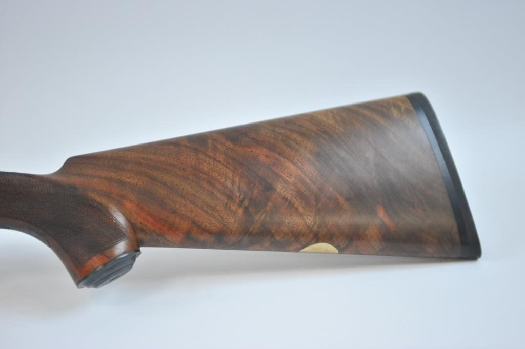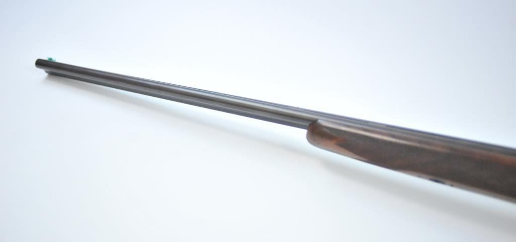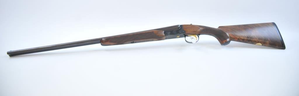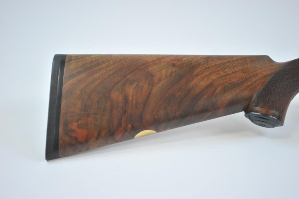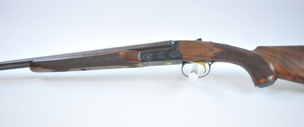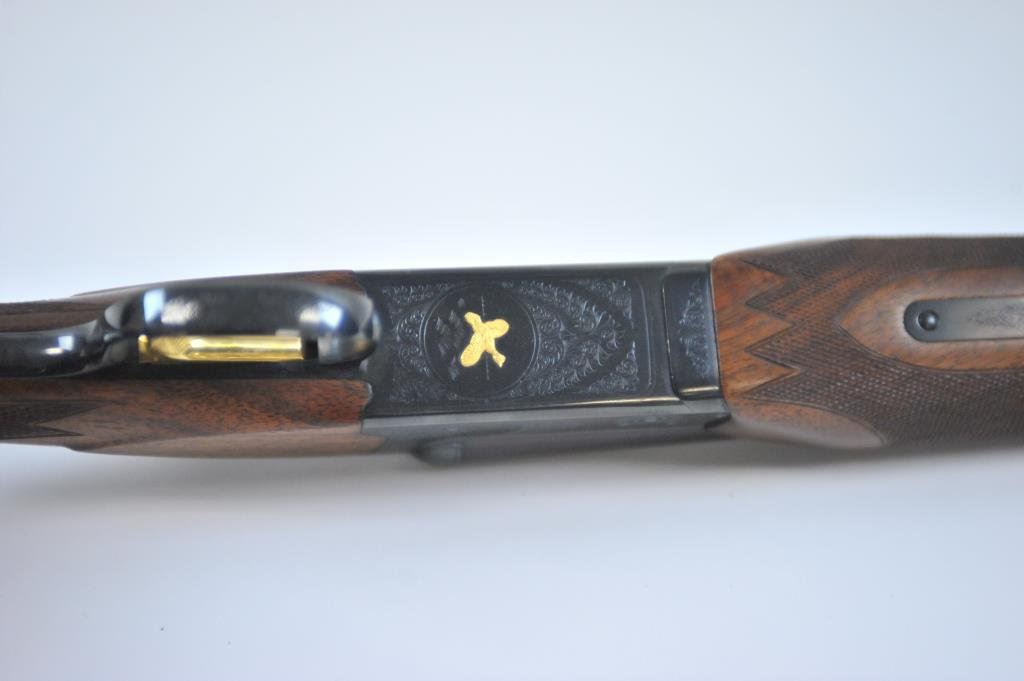 bird on bottom of receiver, .410 gauge, 2-3/4” and 3” chambers, Full choke (L), Modified choke (R), single gold trigger, auto ejectors, 26” ventilated rib barrels, deluxe finely grained checkered wood stocks, Winchester hard rubber butt pad, length of pull is 14-3/4”, #CL410-799E. This gun is in like new condition showing little use or handling. (Modern) Est.: $2000-$4000
